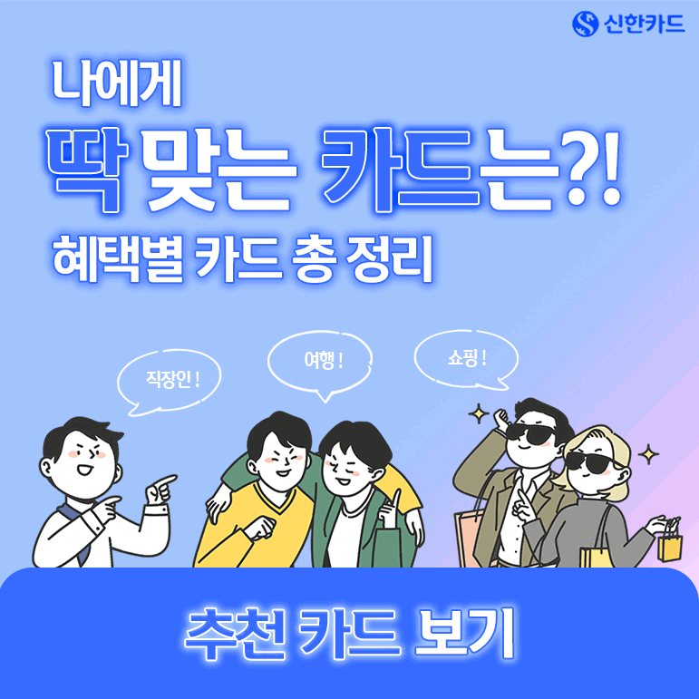 오늘은 신한카드의 다양한 카드들 중에서 나에게 딱 맞는 카드!! 혜택별 카드 총정리 시간을 가져볼까 합니다!