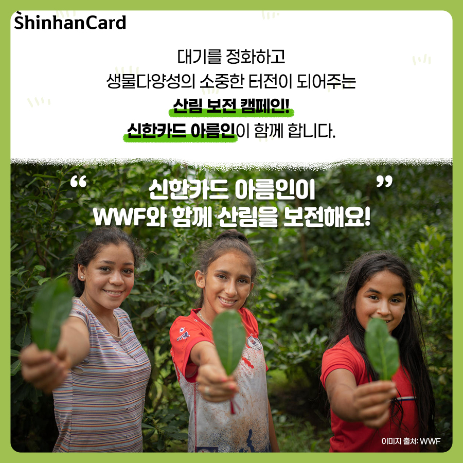 푸르고 울창한 숲, 숲은 약 16억 명의 사람들의 생계를 책임지는 공간이자 수 많은 야생동물을 위한 보금자리이기도 한데요. 이렇게 중요한 숲의 면적이 산업적 토지로의 용도 전환과 농업 용지 확대로 점점 줄어들고 있다고 합니다. 또 각종 개발과 목재 이용 증가 등 인간의 활동으로 인해 울창한 산림이 훼손되고 있죠. 언제나 푸르를 것만 같았던 숲의 존재가 위협을 받고 있는 지금, 이렇게 계속해서 산림이 훼손된다면 기후 위기의 주요 원인이 될 뿐만 아니라 가뭄과 산불 등 자연재해로 지구 전체가 고통받게 된다고 합니다. 그래서 준비한 오늘의 캠페인! 신한카드 아름인이 우리의 삶에서 중요한 산림 보전을 위해 WWF와 함께합니다. 여러분도 산림 보전 캠페인에 함께해 주세요!