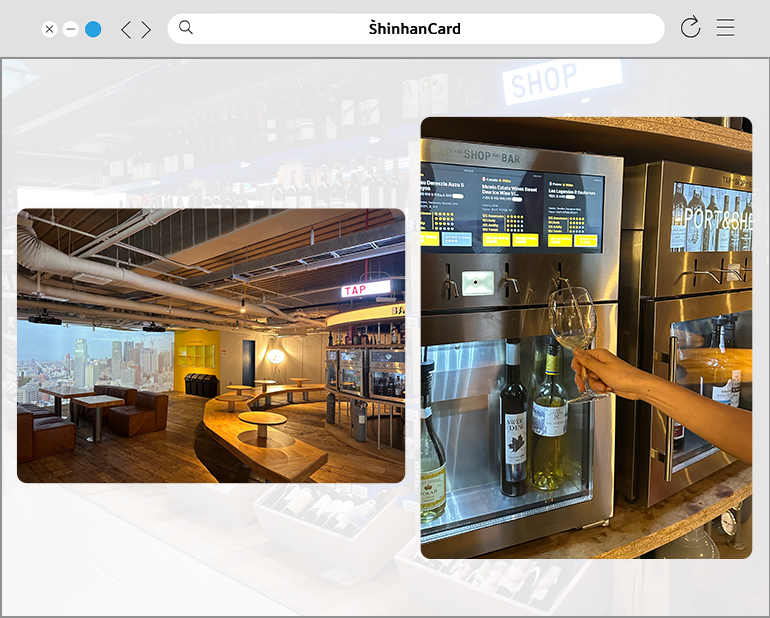 ※ 탭샵바의 ‘탭’은 질소로 기계를 누르는 시스템이라 산화 과정이 느려 장시간 신선한 와인 판매가 가능하다고 합니다.