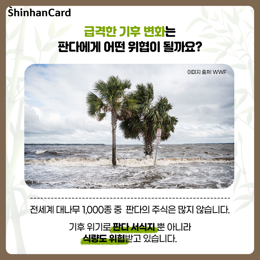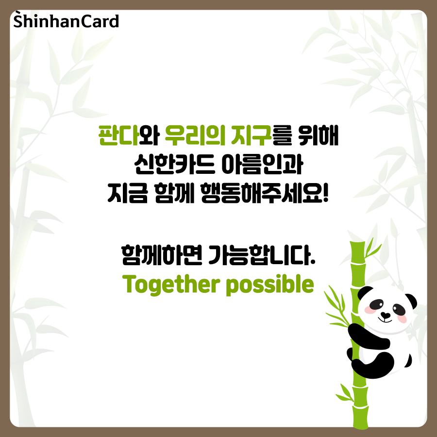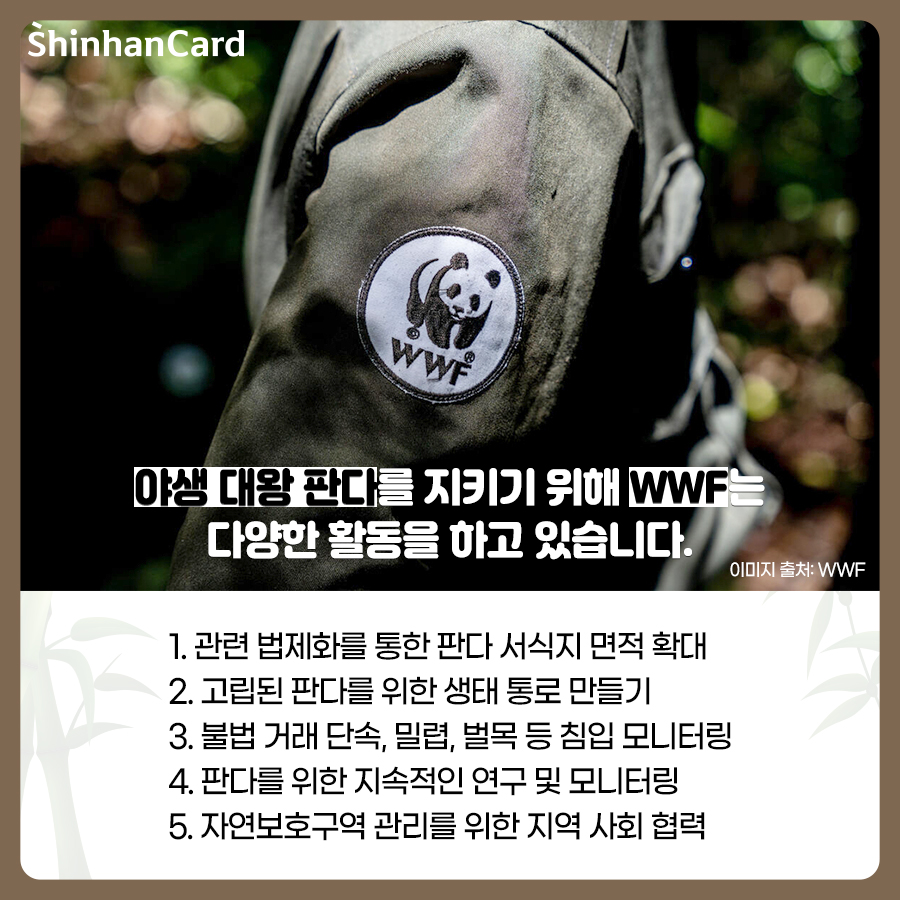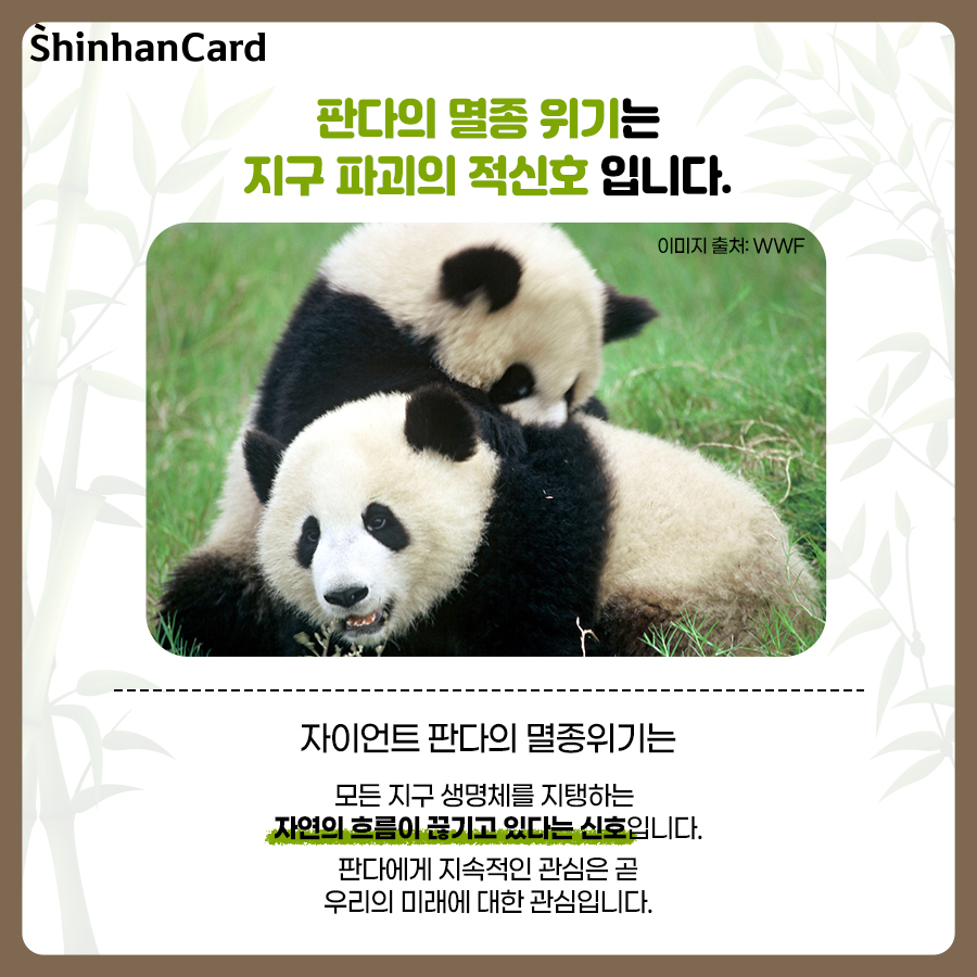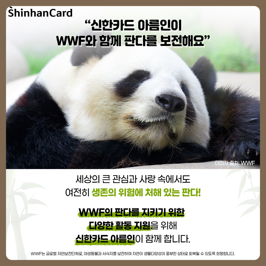 귀여운 외모와 행동으로 많은 사람에게 사랑을 받고 있지만, 여전히 생존의 위험에 처해 있는 판다! 판다 보전을 위해 우리 모두의 노력이 필요합니다. WWF는 글로벌 자연보전 단체로, 야생동물과 서식지를 보전하여 자연이 생물 다양성이 풍부한 상태로 회복될 수 있도록 희망하며, 1980년대부터 판다를 보호하기 위해 다양한 활동을 진행하고 있습니다. 사람과 자연이 조화를 이루며 살아가는 미래를 꿈꾸며, 함께 마련한 후원금은 생물다양성 보전과 환경오염을 줄이는 인식 개선 활동에 지원됩니다. 식물 생태계에서 다양한 생물 종의 유지를 위해 중요한 역할을 하고 있는 대왕판다 보호에 신한카드가 앞장서겠습니다. 여러분도 마음을 더해주세요!