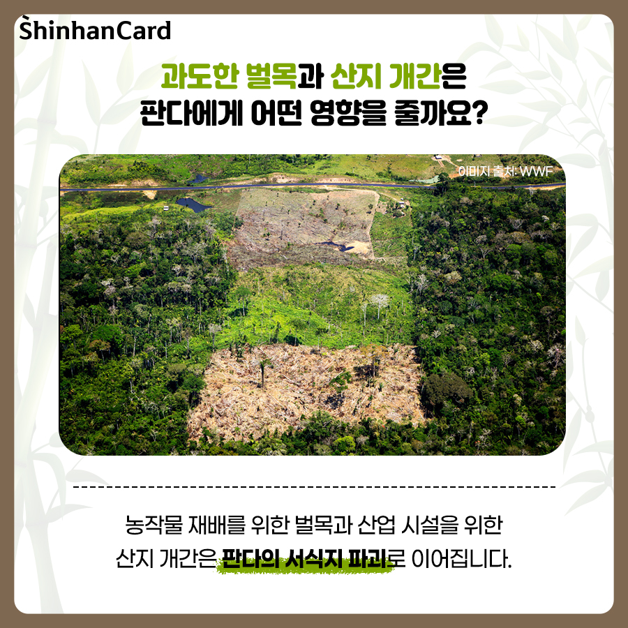 판다의 서식지는 많은 생물 종의 삶의 터전입니다. 판다가 배변 활동을 통해 씨앗을 퍼뜨리면서 각종 식물이 잘 자라도록 돕고 있는 것인데요. 하지만 최근 농작물 재배를 위해 대규모 벌채와 가축 방목으로 판다의 서식지가 파괴되고 있습니다. 또 기후 변화로 평균 온도가 상승함에 따라 판다의 주식인 대나무종이 자라는 서식지도 점점 더 높은 곳으로 이동해서 식량마저 위협받고 있습니다. 서식지 파괴로 판다 생태계가 흔들리고 멸종하게 된다면 이에 따라 모든 생물종과 인류는 더 큰 피해를 겪게 될 것입니다.