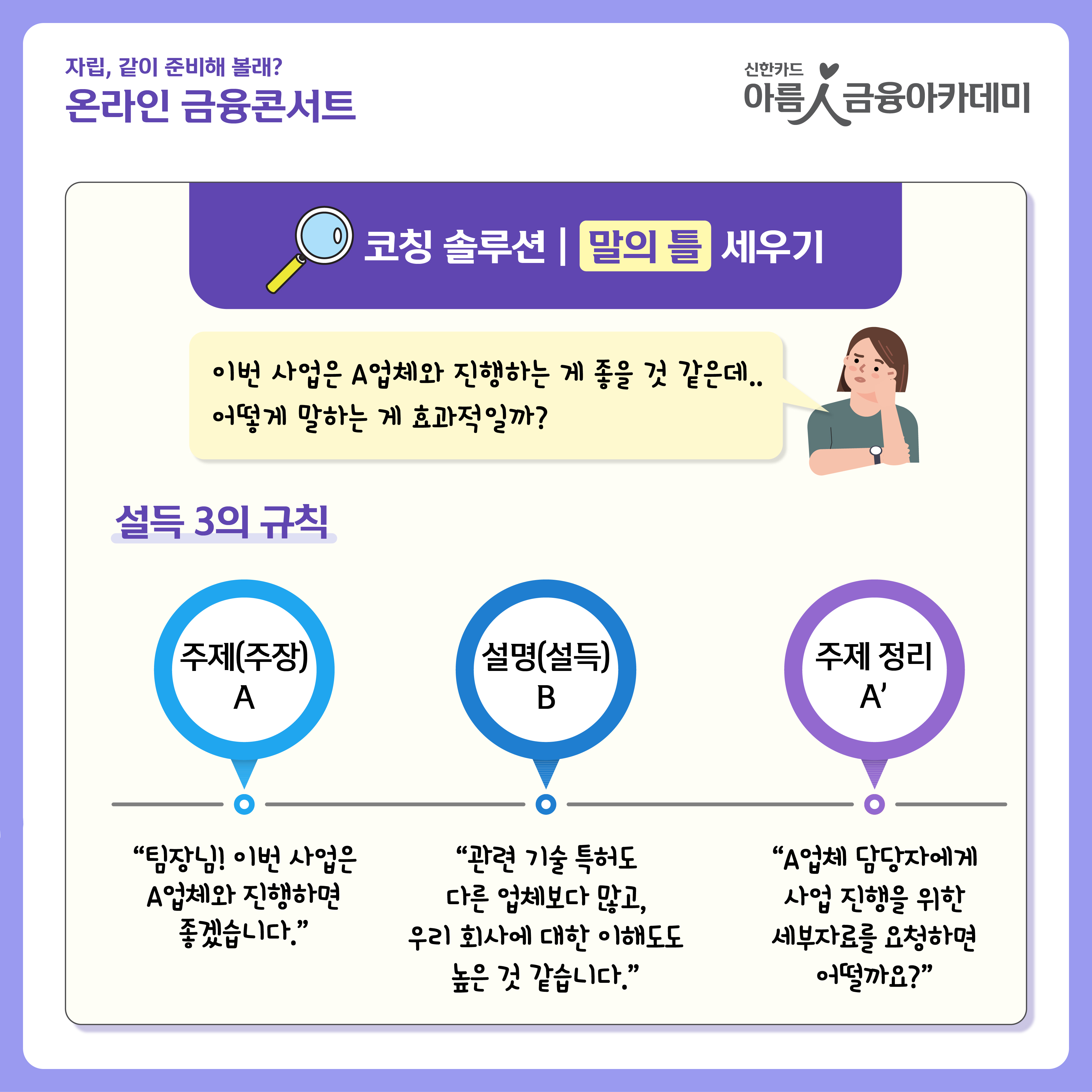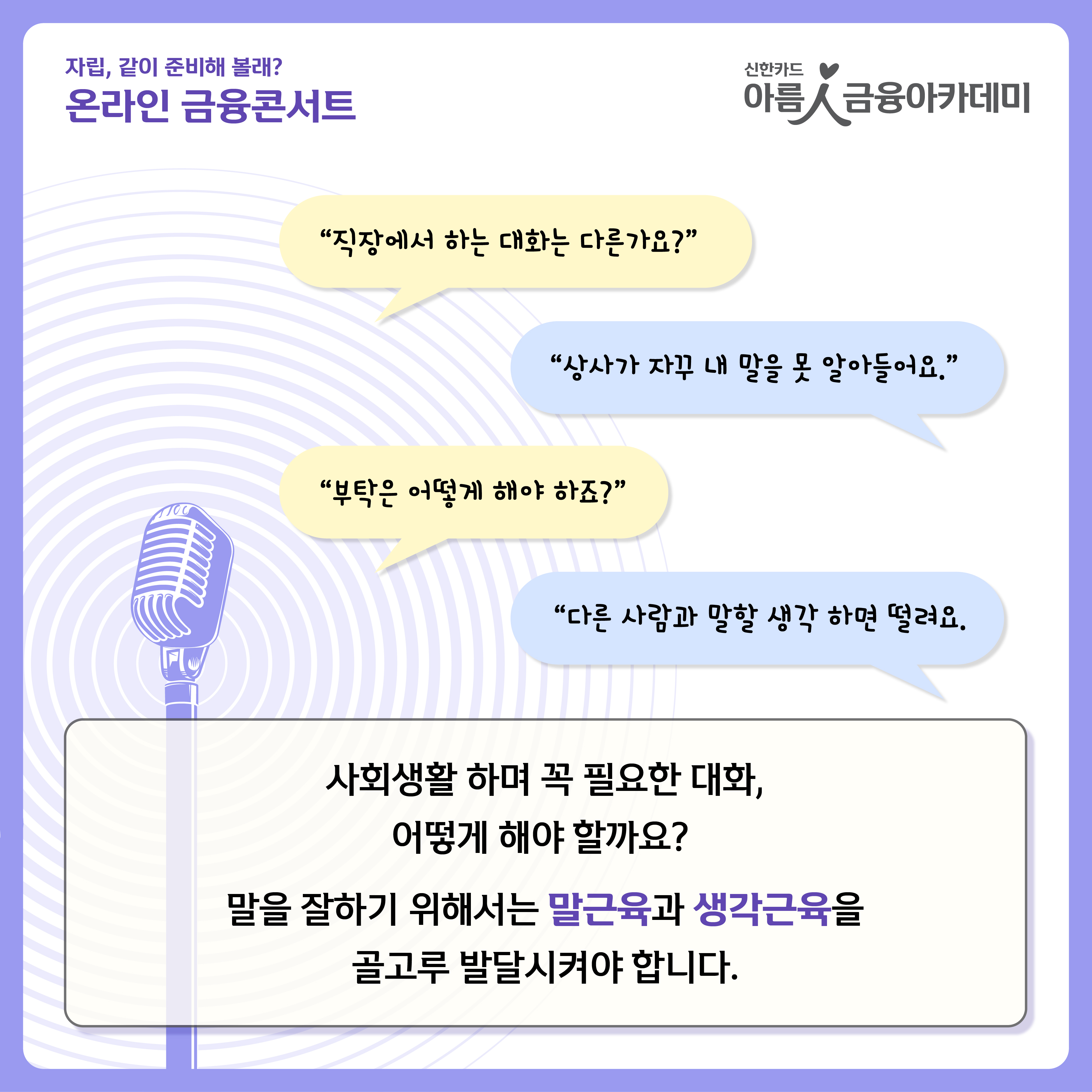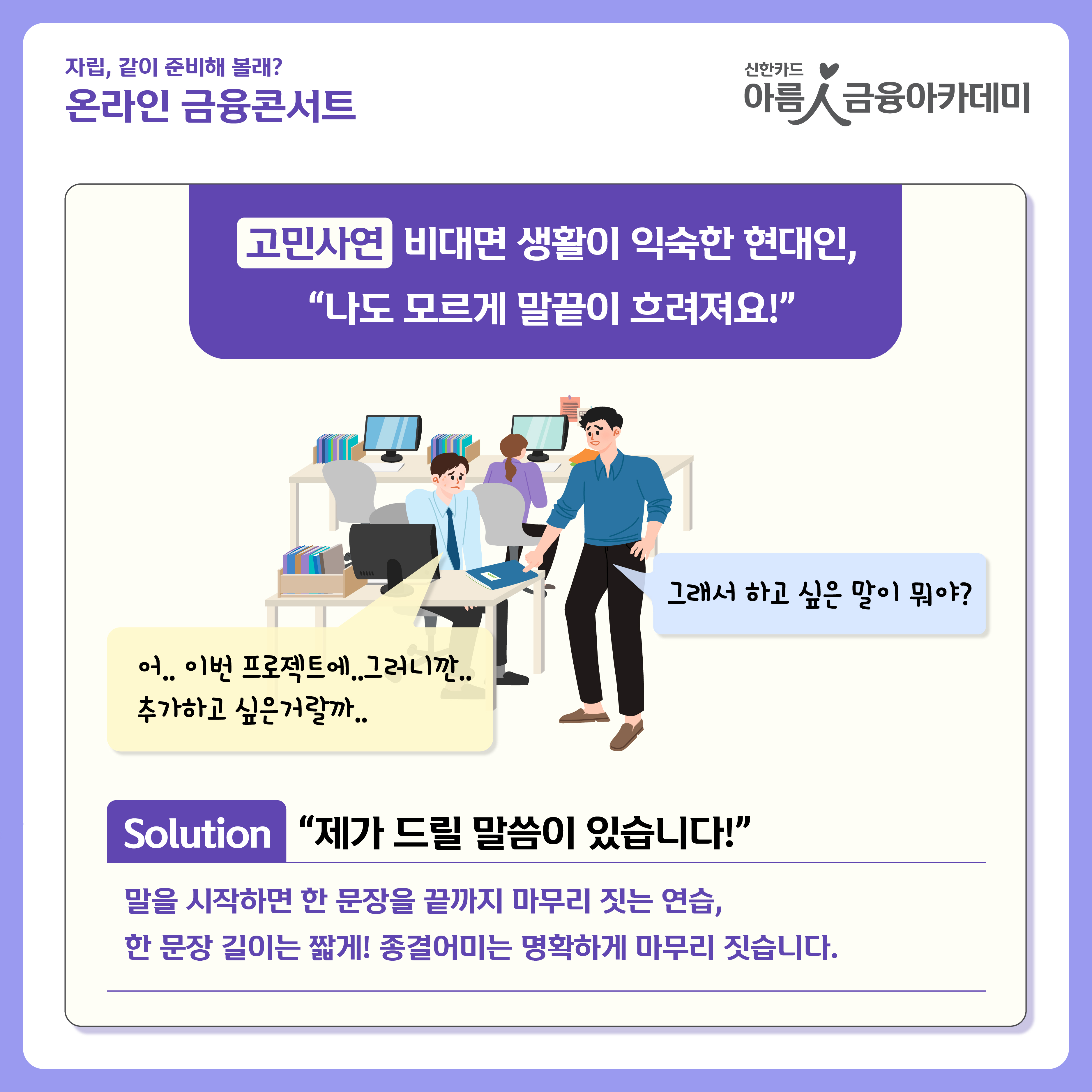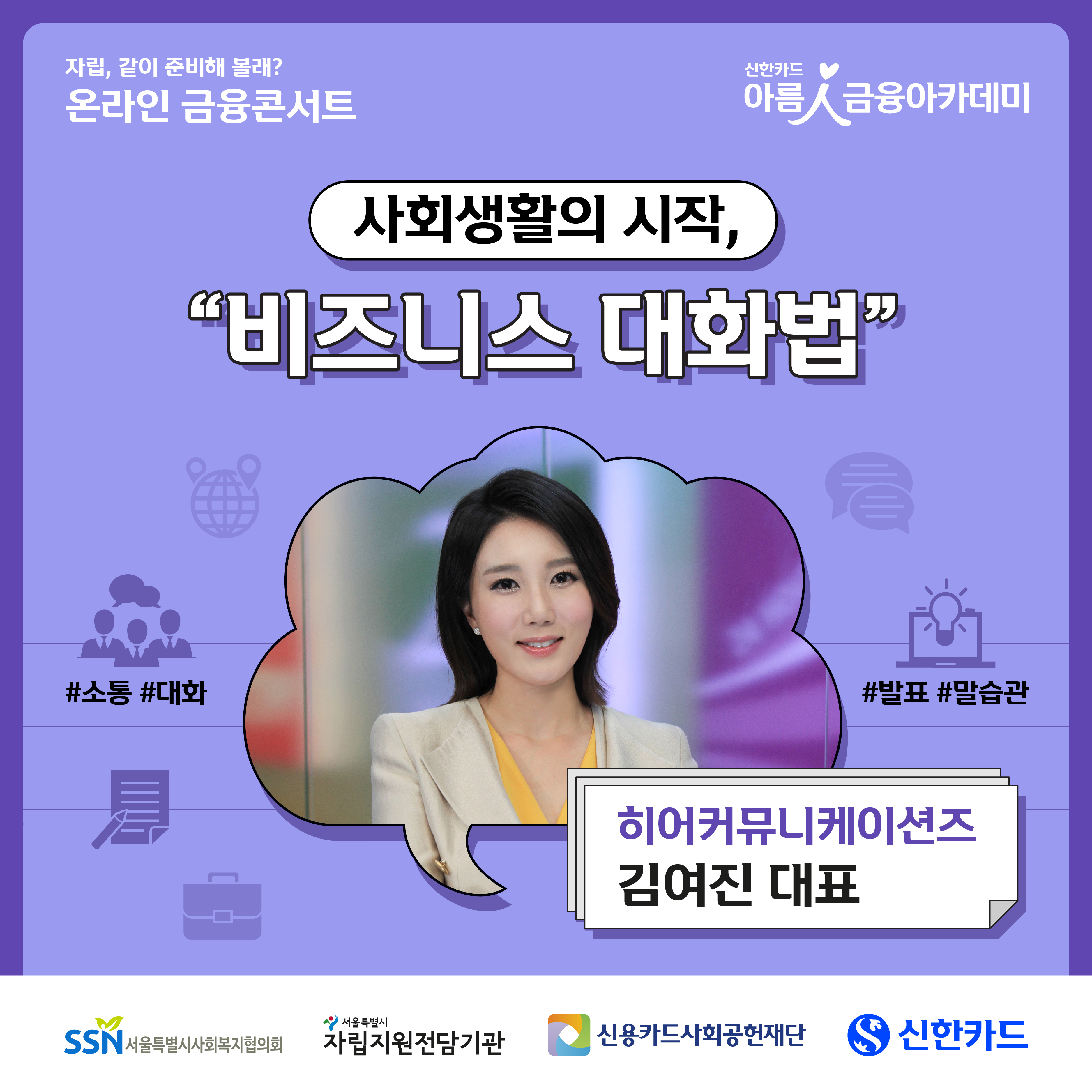 지난 6월에 진행된 첫 번째 시간에는 사회생활의 시작이자 기본이 될 사회 초년생들을 위한 '비즈니스 대화법'을 주제로 올바른 비즈니스 대화를 하기 위한 솔루션을 알아봤는데요. 소통을 위해 말을 잘하기 위한 방법에는 어떤 방법이 있는지 커뮤니케이션 전문가 김여진 대표가 함께한 온라인 금융콘서트의 프로그램 내용을 함께 살펴볼까요?