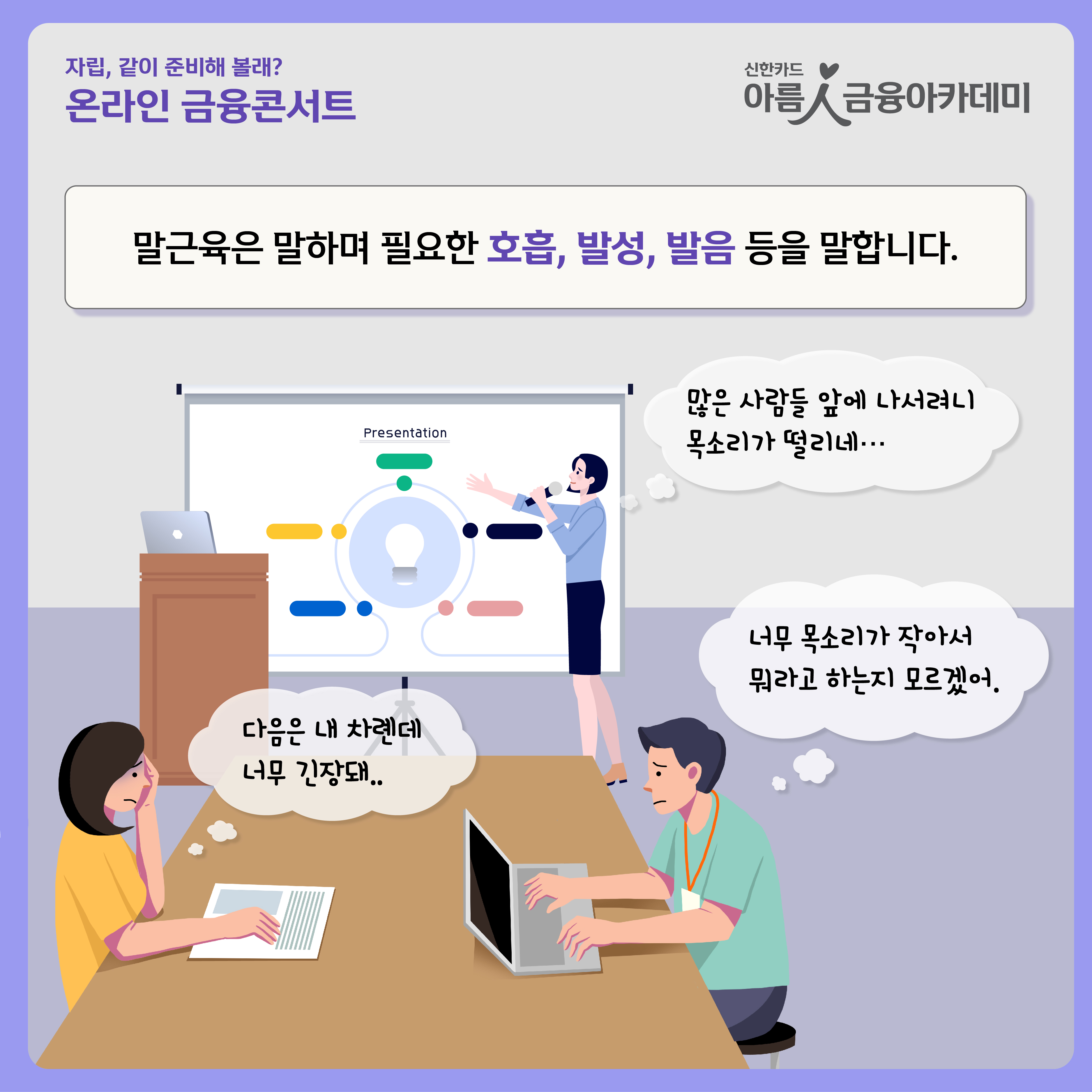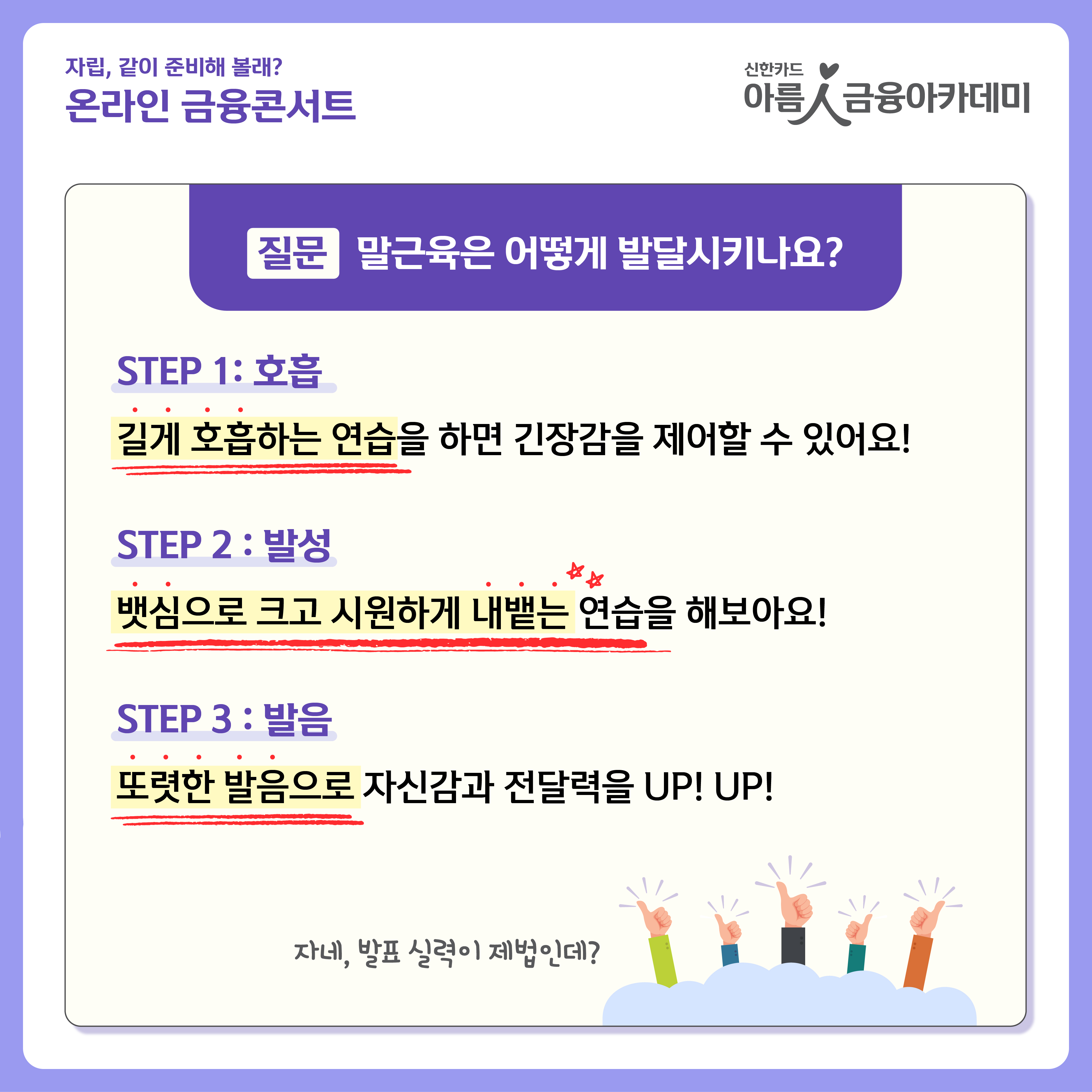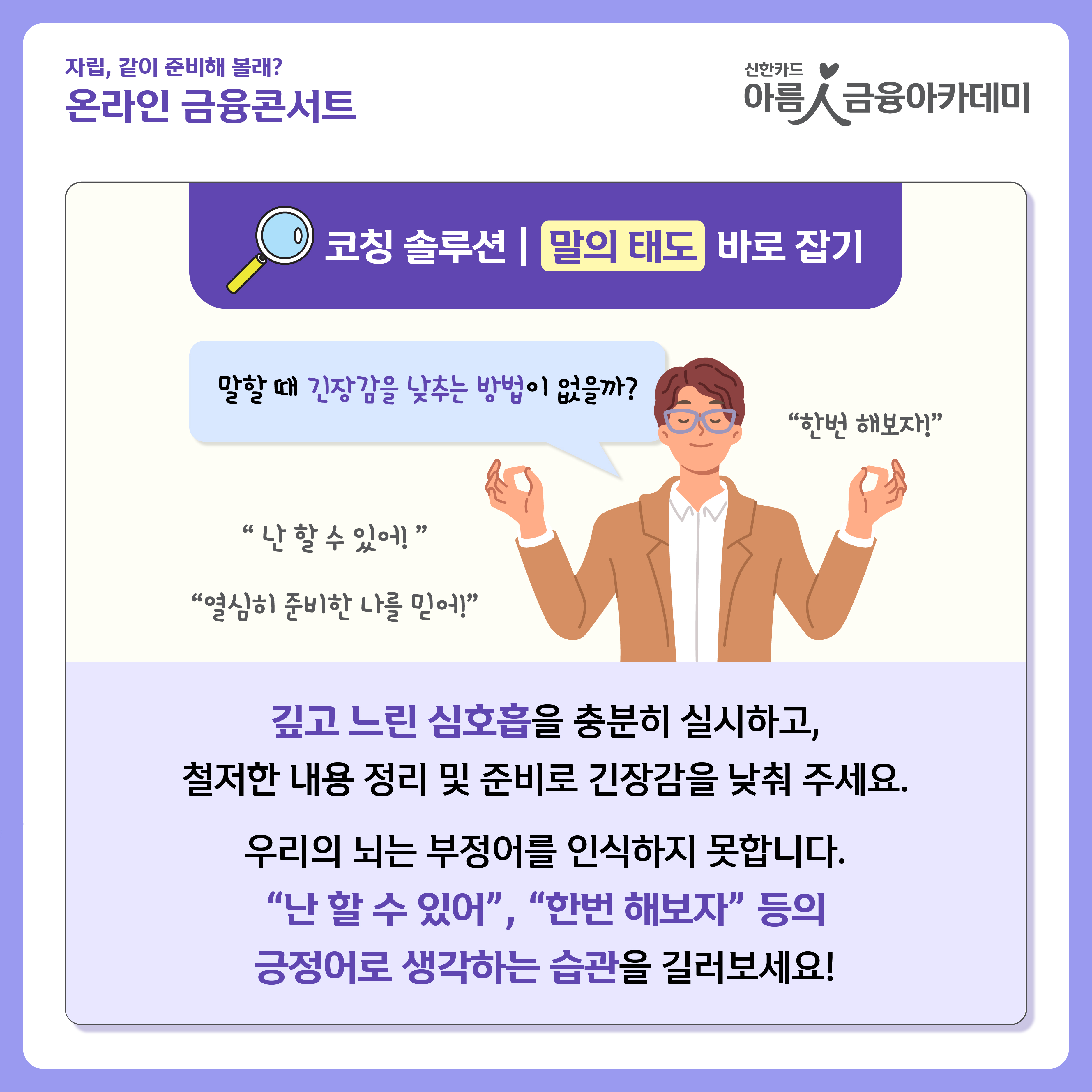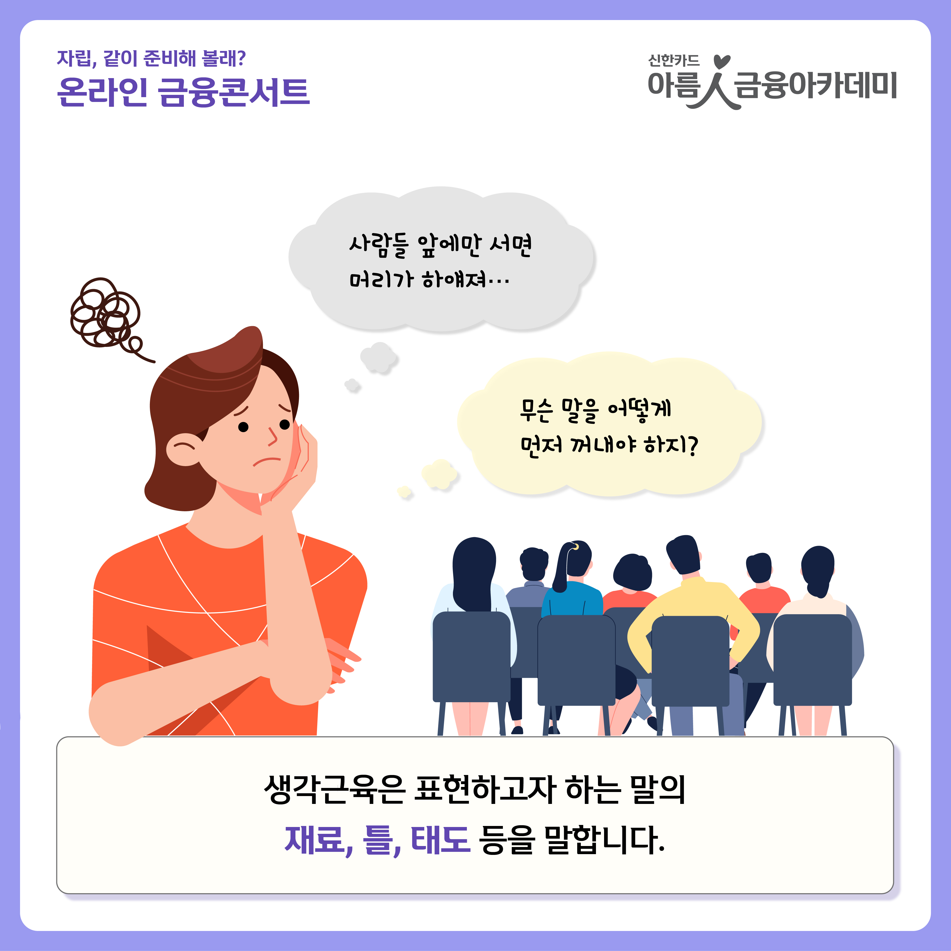지난 6월에 진행된 첫 번째 시간에는 사회생활의 시작이자 기본이 될 사회 초년생들을 위한 '비즈니스 대화법'을 주제로 올바른 비즈니스 대화를 하기 위한 솔루션을 알아봤는데요. 소통을 위해 말을 잘하기 위한 방법에는 어떤 방법이 있는지 커뮤니케이션 전문가 김여진 대표가 함께한 온라인 금융콘서트의 프로그램 내용을 함께 살펴볼까요?