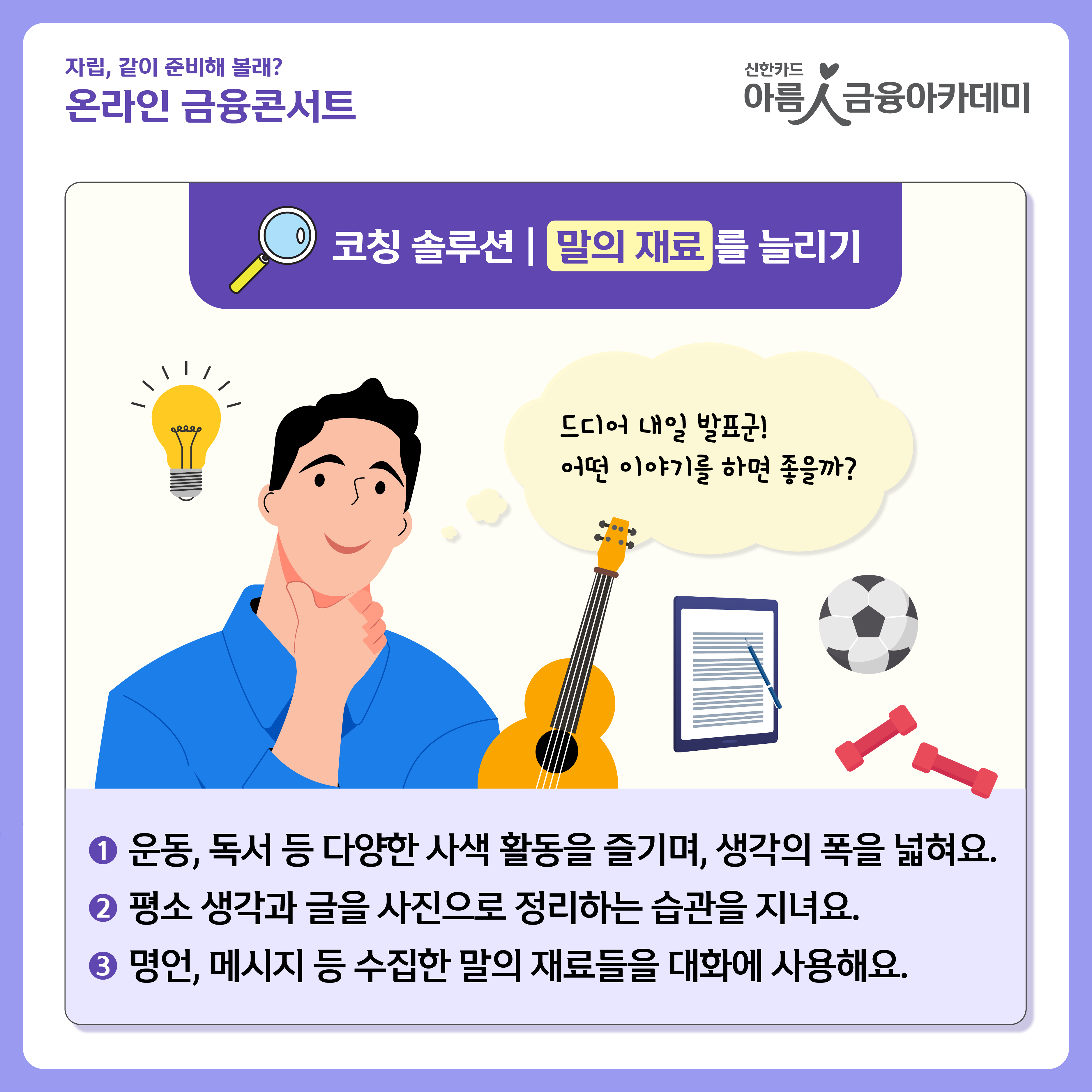 다음 온라인 금융콘서트 후기는 금융 정보공학과 교수님과 함께 '자립지원금 똑똑하게 관리하기' '내 손에 들어온 목돈, 어떻게 관리해야 할까?' '저축과 투자 중 뭘 하는게 좋을까?' 에 대한 내용으로 찾아오겠습니다. 신한카드는 경제적 자립을 꿈꾸는 청년들의 더 나은 미래를 위해 다양한 프로그램을 제공할 예정이니, 많은 기대와 참여 부탁드립니다. 앞으로 신한카드가 만들어갈 지속 가능한 미래를 위한 행보를 지켜봐 주세요!