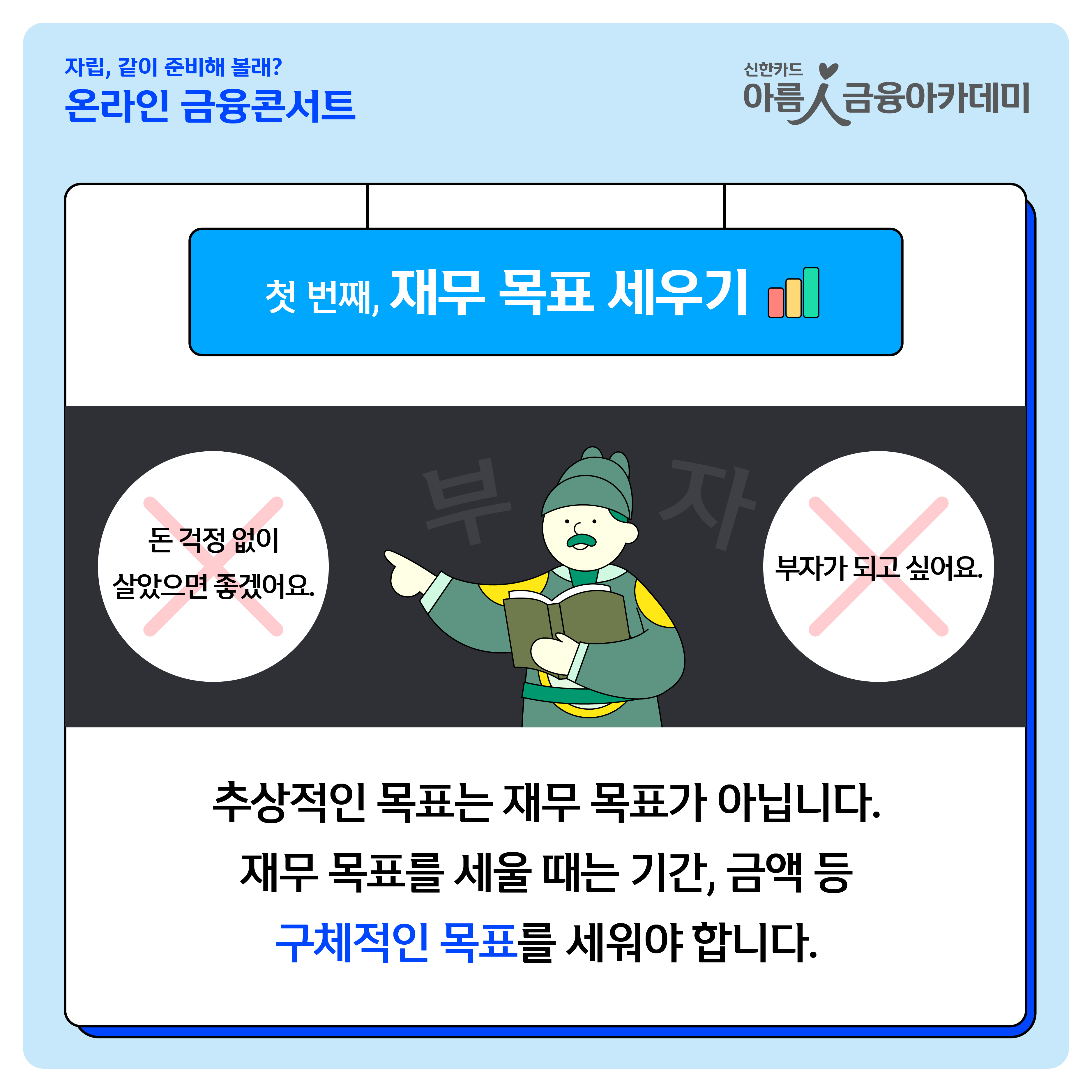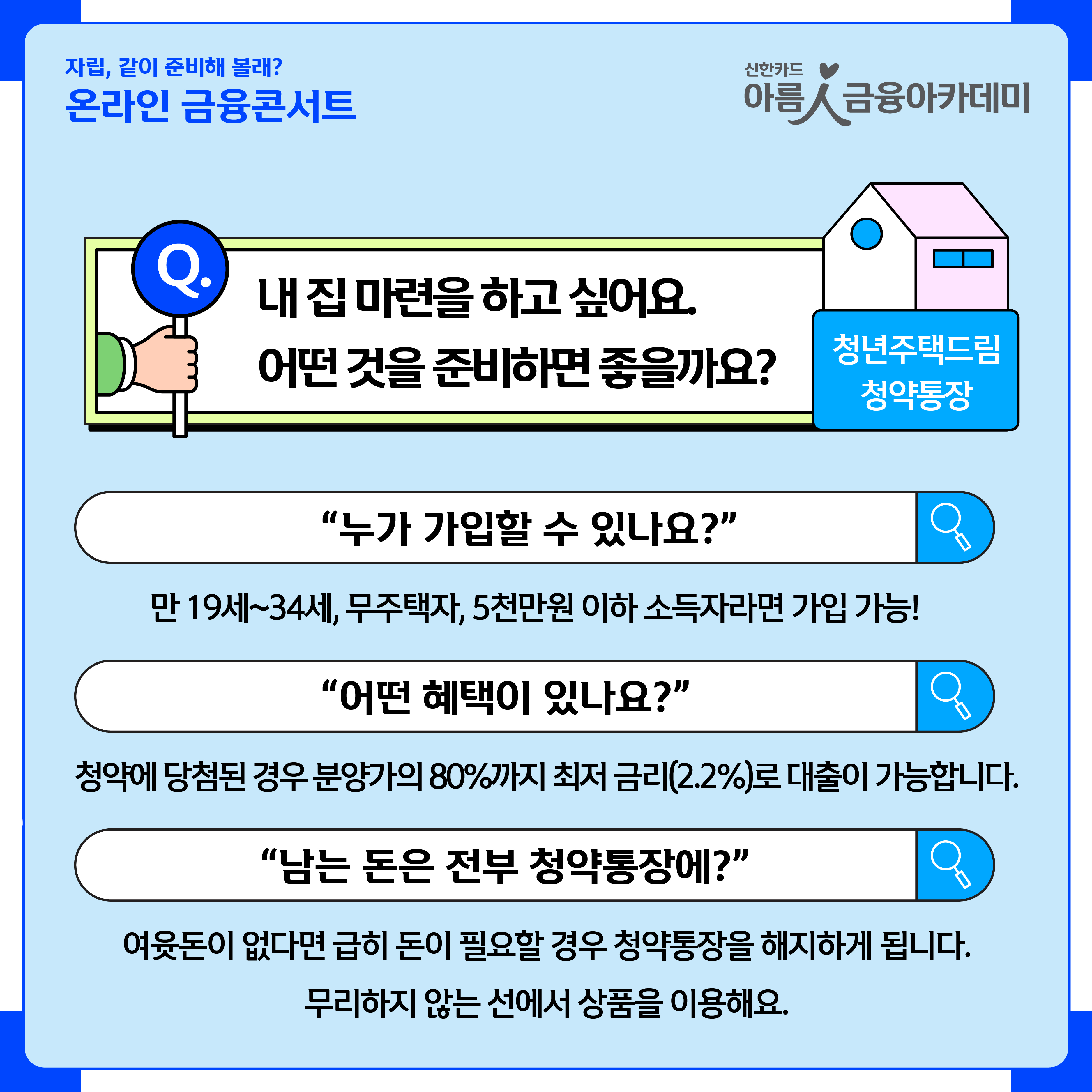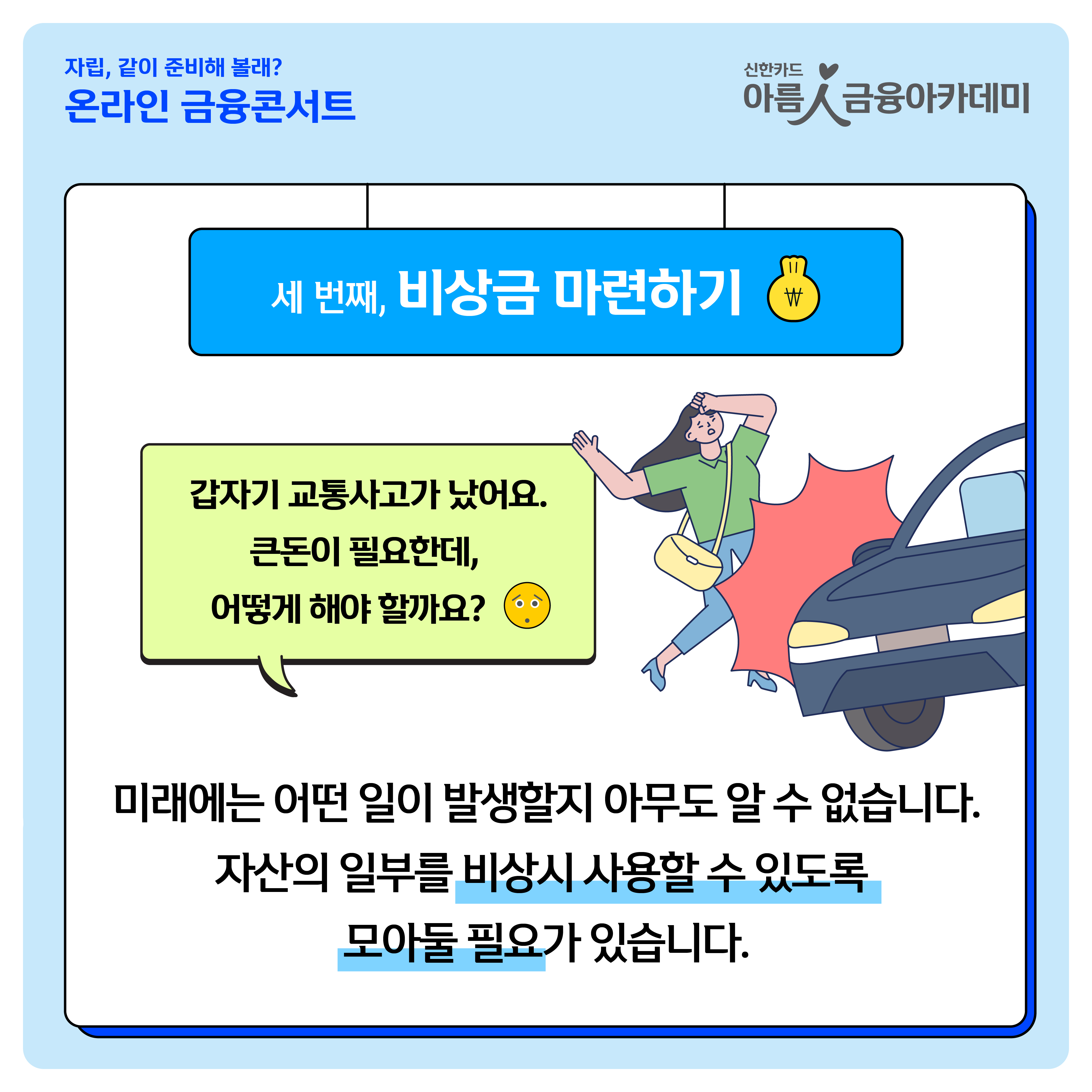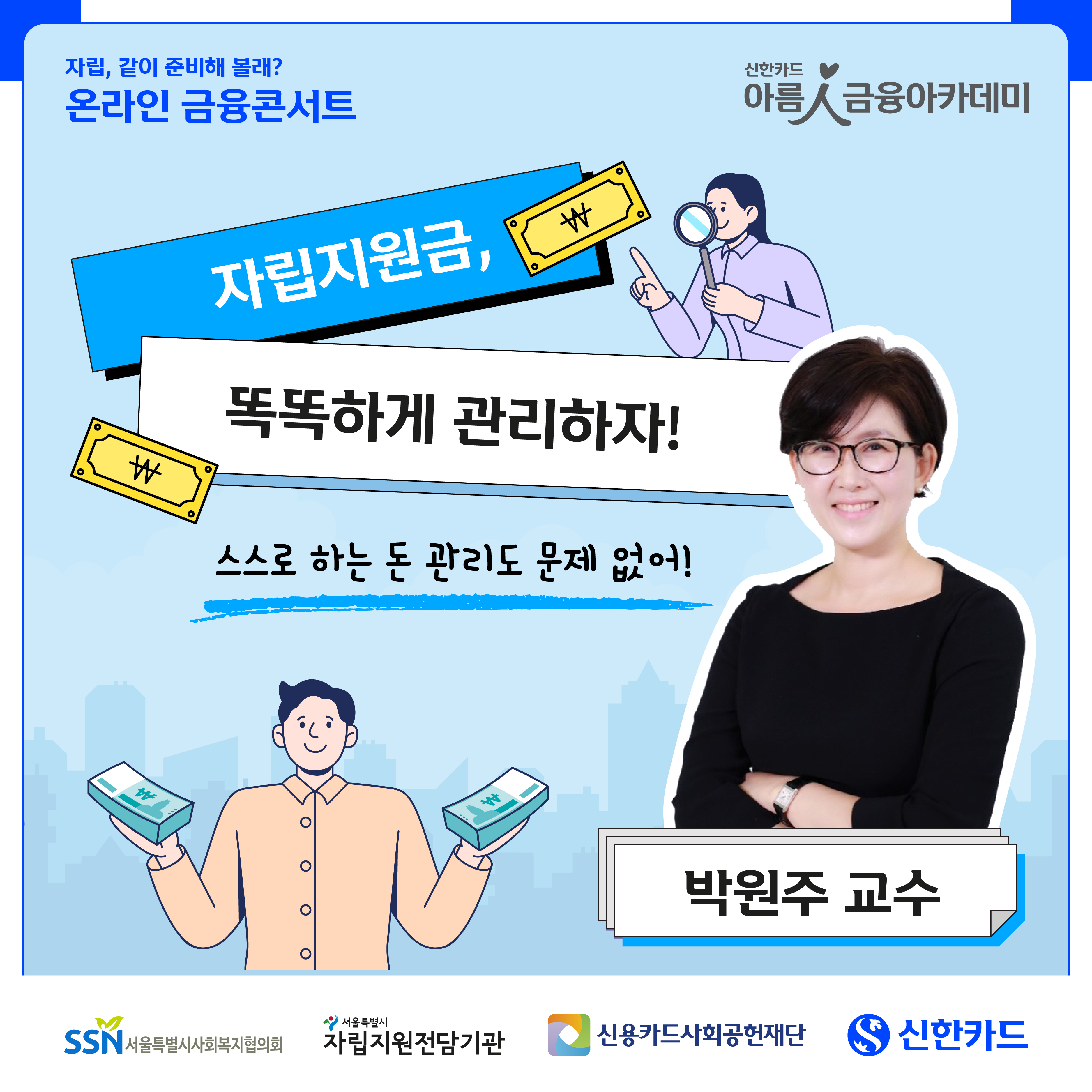 자립준비 청년들을 위해 신한카드 아름인 금융아카데미에서 준비한 온라인 금융콘서트 2탄! 이번 시간에는 미래를 위한 자립지원금을 주도적으로 사용하고 똑똑하게 관리하는 자립지원금 관리법에 대해 알아보았는데요. 금융정보공학과 박원주 교수님과 함께한 이번 온라인 금융콘서트! 내가 스스로 관리하는 똑똑한 목돈관리 비법에는 어떤 방법들이 있을지 자세히 살펴보겠습니다.