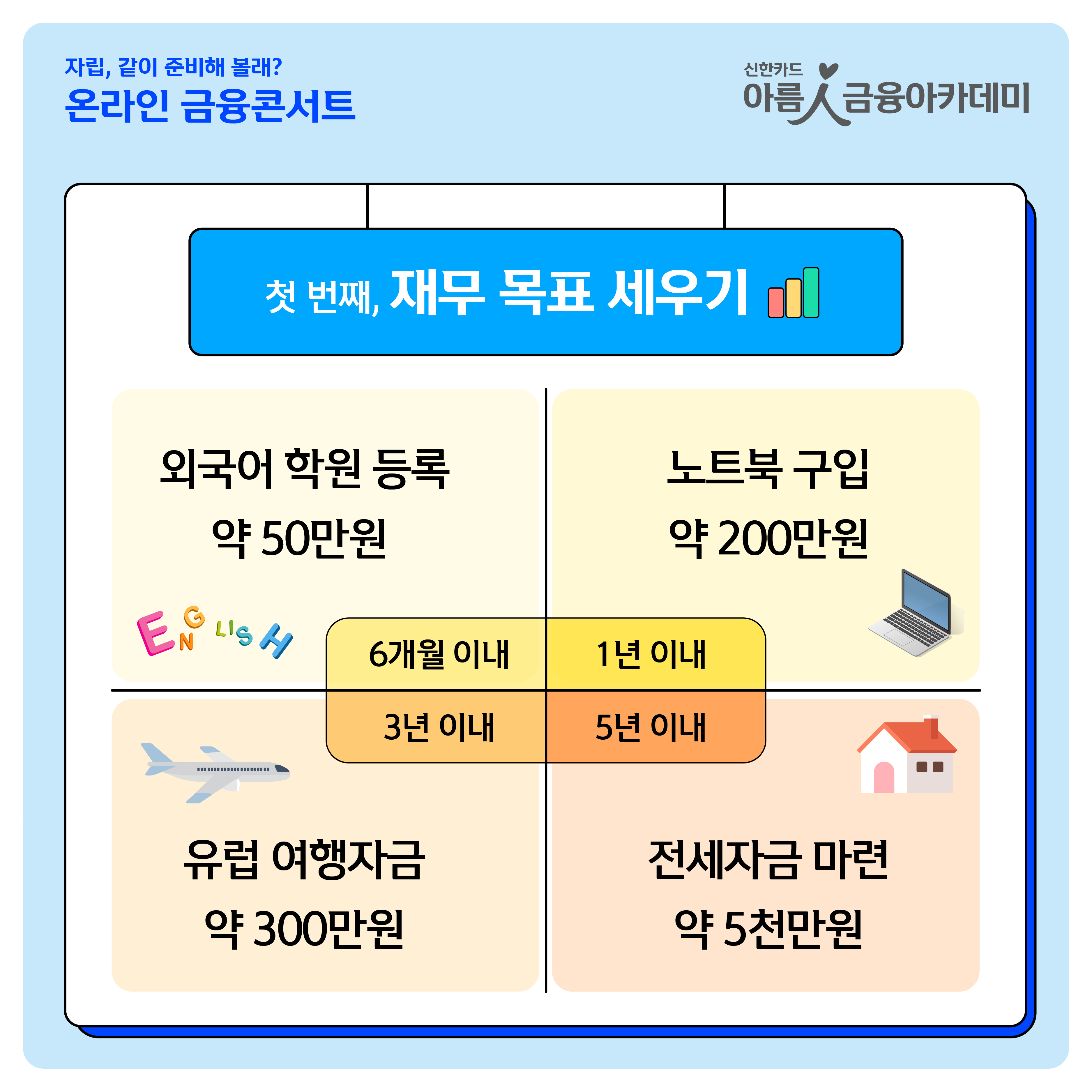 자립을 위한 소중한 비용을 똑똑하게 관리하고 싶다면 인생을 전체적으로 바라보고 구체적인 재무 목표와 재무 목표 기간에 맞는 올바른 금융상품을 선택하는 것이 중요합니다. 이러한 준비는 장기적인 재정적 안정과 더 나은 미래를 위한 든든한 기반이 되어 경제적 자립의 밑거름이 될 거예요.
