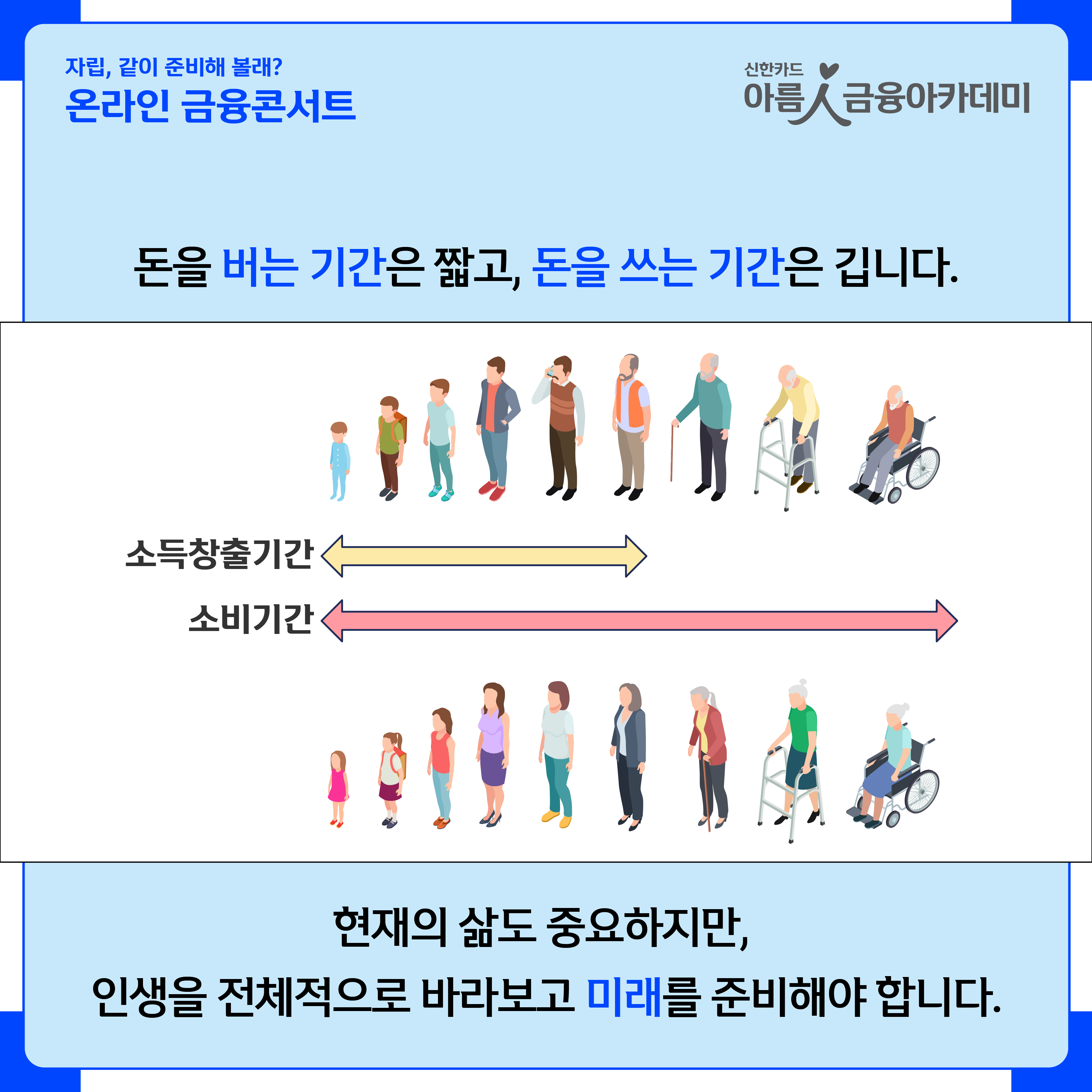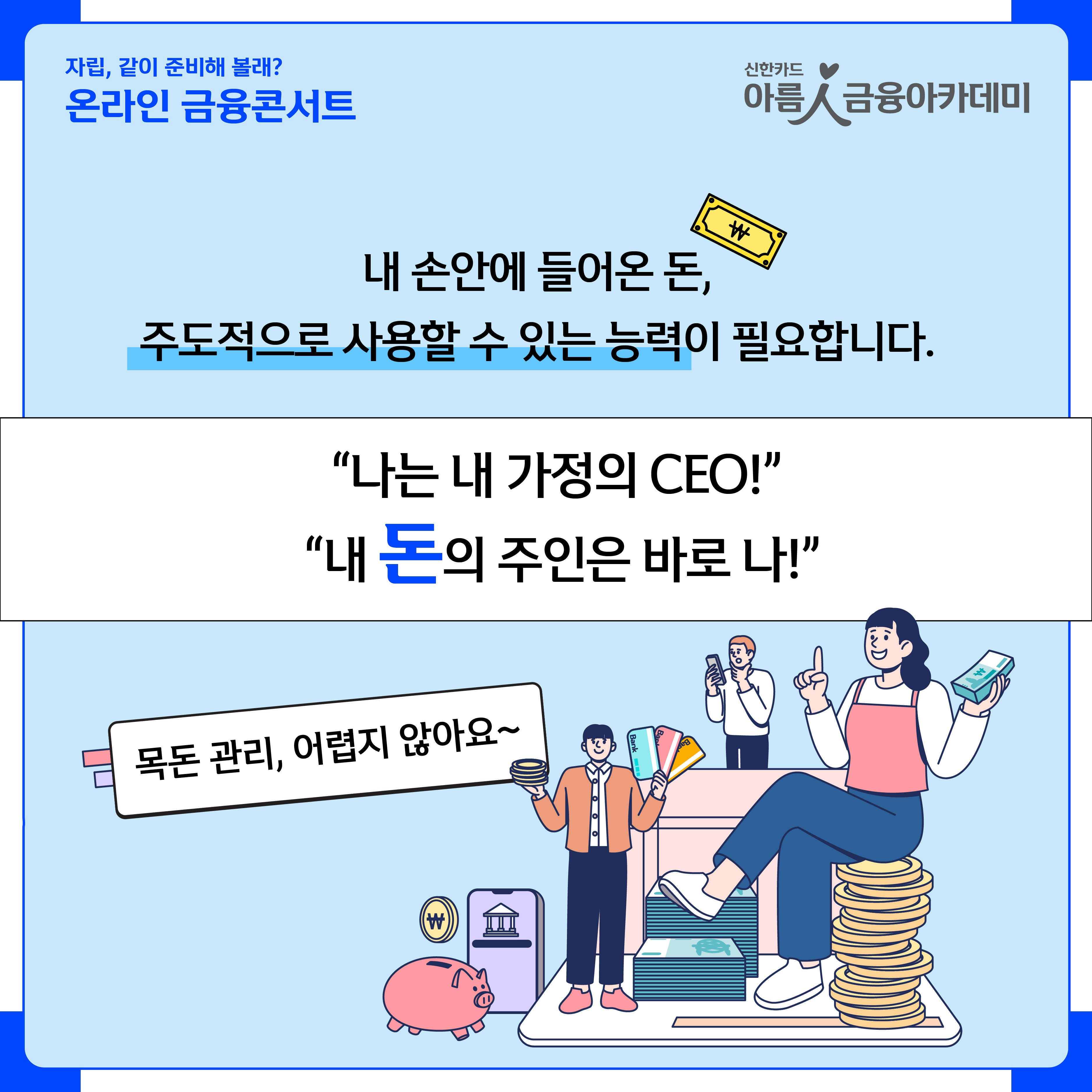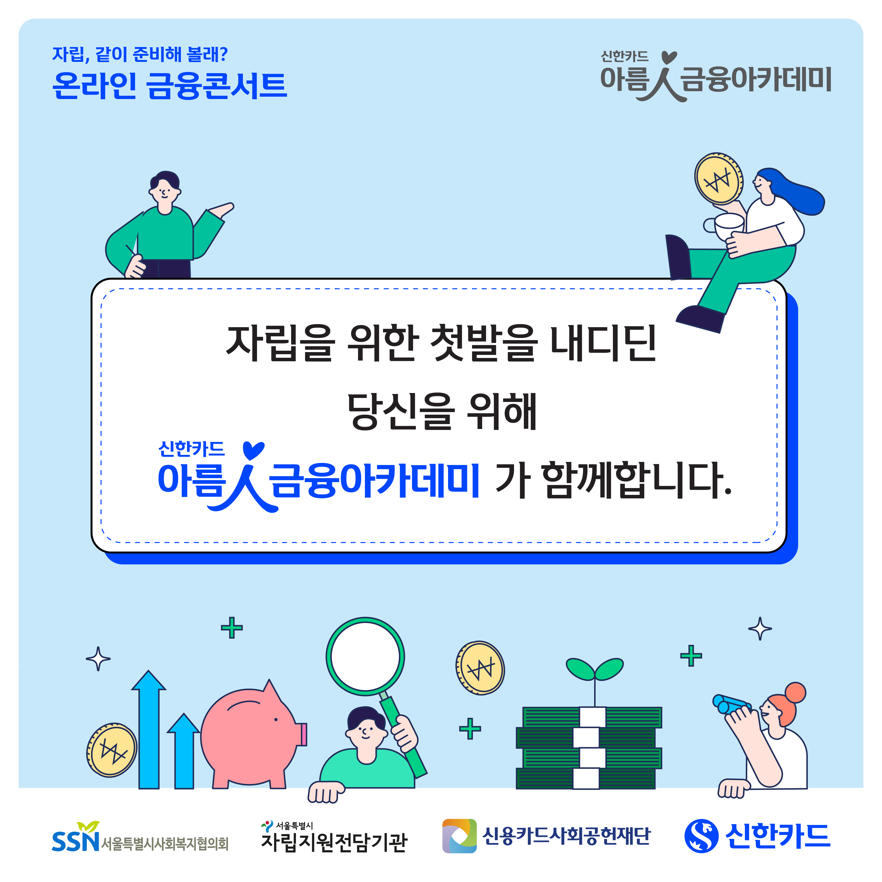 이번 2회차 온라인 금융콘서트, 어떠셨나요? 자립을 앞두고 막막하기만 했던 비용관리에 대해 알 수 있었던 알찬 시간이 되었기를 바랍니다. 여러분의 든든한 미래를 위한 신한카드 아름인 금융아카데미는 더 좋은 프로그램으로 다시 찾아뵙겠습니다.