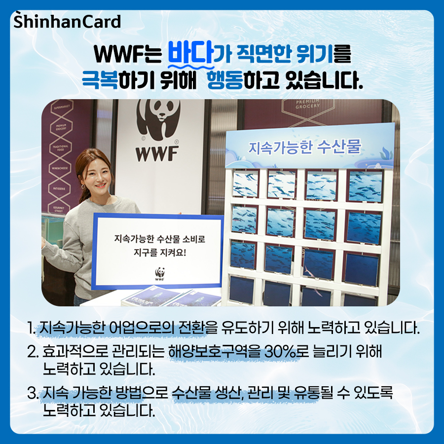 WWF는 수산자원 보호와 지속 가능한 수산물 생산 및 유통 확대를 위해 정부와 협력하는 등 지속 가능한 어업으로의 전환을 위해 노력하고 있습니다. 또한, 해양생물 보전을 위해 국제적 다자 협력체계를 구축하고, 국내 관련 기관들과 협력해 기초 생물학적 연구 지원을 하는 등 대책 마련을 위해 노력하고 있으며, 전 세계 바다로 퍼지는 오염물질로부터 해양을 보호하기 위해 국제 협약 마련에 힘쓰고 있습니다. 바다가 직면한 위기를 극복하기 위해 행동하는 WWF와 해양보전을 위해 진행하는 다양한 활동 지원에 신한카드가 앞장서겠습니다. 여러분도 함께해 주세요!