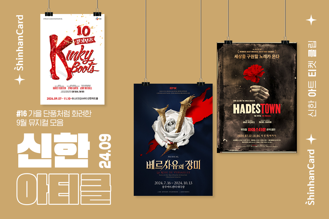 끝나지 않을 것 같은 무더운 더위도 제법 기세가 꺾여가는 요즘, 새로운 계절을 맞이하는 설렘을 아낌없이 채워줄 화려하고 풍성한 이야기들을 준비했습니다. 녹록지 않은 우리네 인생에 기꺼이 축배를 들게 하는 도전과 모험의 서사를 담은 이야기 가득한 뮤지컬 세상! 올가을 단풍처럼 다채로운 서사로 채워진 9월의 뮤지컬을 신한카드가 소개합니다.
