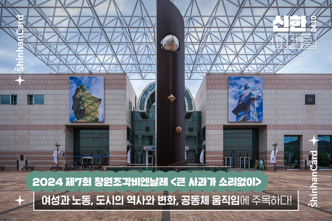 창원특례시와 (재)창원문화재단에서 주최/주관하는 창원조각비엔날레는 2010년 문신국제조각심포지엄을 모태로 2012년부터 비엔날레 형식으로 개최해왔습니다. 올해 비엔날레의 제목인 <큰 사과가 소리없이>는 김혜순 시인의 시 <잘 익은 사과>의 한 구절을 차용했는데요. 45일간 16개국 86명(63팀)의 국내외 작가, 협업자와 함께하며 동시대 조각의 수평성, 여성과 노동, 도시의 역사와 변화, 공동체의 움직임 등을 다각도로 다루며 창원을 기반으로 하는 다수의 커미션 신작 등 총 177점을 선보일 예정입니다. 특히 시와 조각의 언어에서 출발한 이번 비엔날레는 역대 창원조각비엔날레의 주요 전시 장소였던 성산아트홀, 1973년 발견된 조개무덤인 사적 제240호 성산패총, 과거 산업단지 근로자의 활동 장소였던 창원복합문화센터 동남운동장(이하 ‘동남운동장’), 조각가 문신이 직접 설립한 창원시립마산문신미술관(이하 ‘문신미술관’)까지 총 네 곳에서 펼쳐집니다. 올해 창원의 곳곳에서 펼쳐질 창원조각비엔날레와 함께 다양한 비엔날레 작품들을 감상해 보시길 바랍니다.