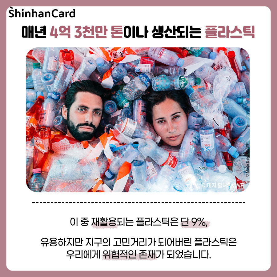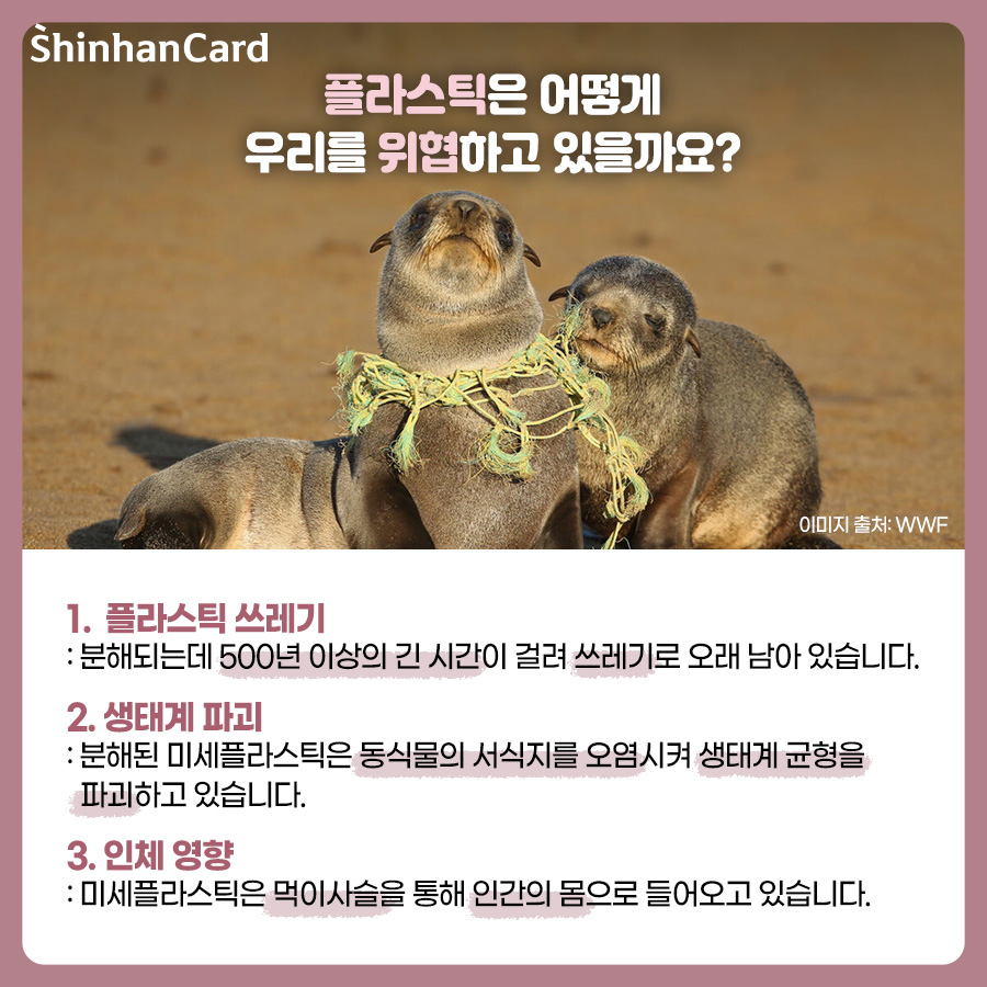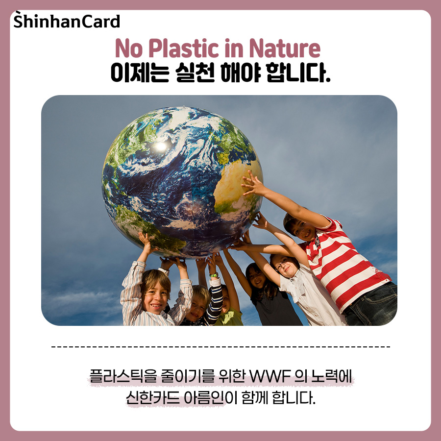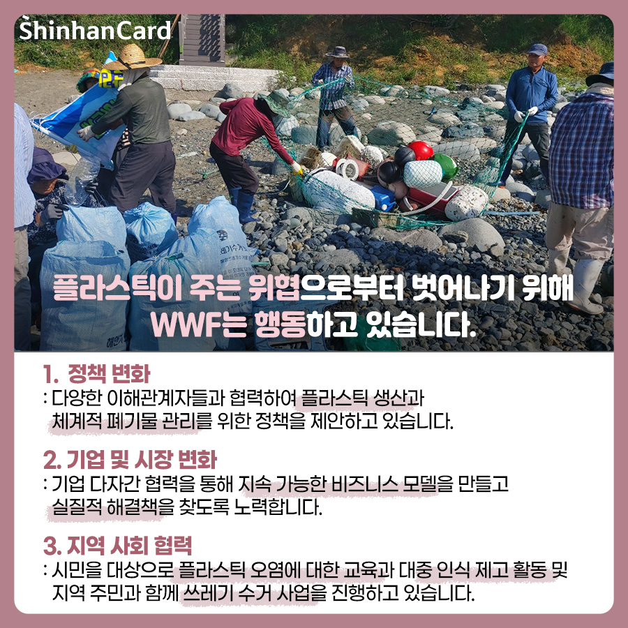 플라스틱이 주는 위협으로부터 벗어나기 위해 WWF는 행동하고 있습니다. 다양한 이해관계자들과 협력하여 플라스틱 생산과 체계적 폐기물 관리를 위한 정책을 제안하고 있고, 기업 다자간 협력을 통해 지속 가능한 비즈니스 모델을 만들고 실질적 해결책을 찾도록 노력하고 있습니다. 뿐만 아니라 시민을 대상으로 플라스틱 오염에 대한 교육과 대중 인식 제고 활동 및 지역 주민과 함께 쓰레기 수거 사업을 진행하고 있습니다. 플라스틱을 줄이기 위한 WWF의 노력에 신한카드 아름인이 함께합니다!