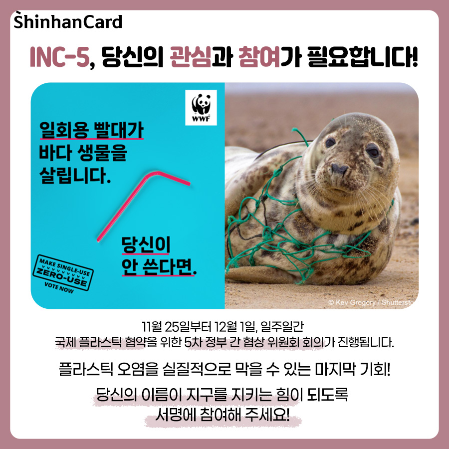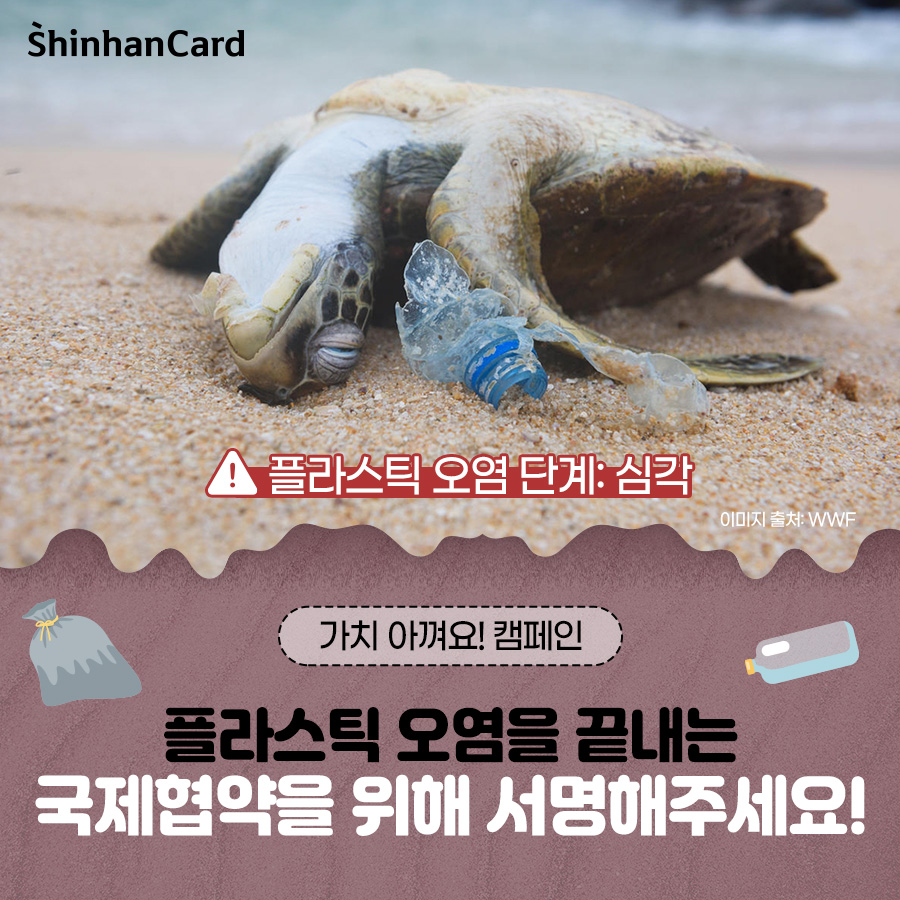 지금 전 세계는 플라스틱 오염을 종식시키기 위한 협약 체결을 위해 국제협상을 진행하고 있는데요. 11월 25일부터 12월 1일, 일주일간 국제 플라스틱 협약을 위한 5차 정부 간 협상 위원회 회의가 진행됩니다. 이 회의는 2024년 마지막 협상자리로 플라스틱 오염을 실질적으로 막을 수 있는 마지막 기회입니다. 이번 11월에는 신한카드 아름인이 WWF와 함께 ‘노 플라스틱 인 네이처’ 캠페인을 진행합니다. 당신의 이름이 지구를 지키는 힘이 되도록 서명에 참여해주세요!