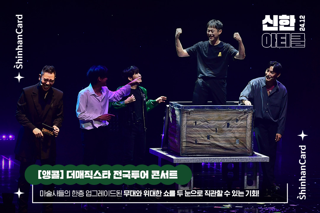 5개 도시에서 2만여 명의 관객을 동원하며 가족 공연의 흥행 신화를 쓴 <더매직스타>가 앵콜 전국투어로 돌아옵니다. 대중에게 첫선을 보였던 더매직스타 전국투어 시즌1이 온 가족이 즐기는 대중 공연으로 큰 사랑을 받은 것은 물론, 팬들의 끊임없는 요청으로 앵콜 콘서트가 개최되는 만큼 한층 더 풍성하고 개성 가득한 무대가 펼쳐질 것으로 기대가 되는데요. 다시 한번 환상적인 마술로 관객을 열광하게 할 <더매직스타>는 오는 12월 수원, 부산에 이어 1월 성남까지 3개 도시에서 콘서트를 진행할 예정입니다.