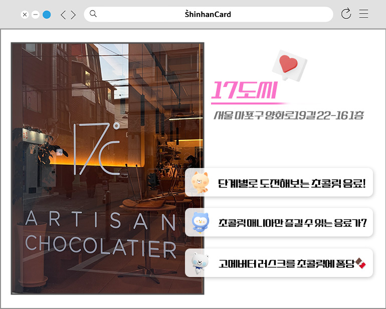 초콜릿을 가장 맛있게 보관할 수 있는 온도는 17°C라고 합니다. 여기에서 따온 이름의 초콜릿 전문점 17도씨! 입구에서부터 5개가 훌쩍 넘는 블루리본이 인상적인 이곳은 마포구 일대의 이색 카페로 이미 정평이 나 있는 곳인데요. 평일 낮에 가도 웨이팅이 있을 정도로 ‘초코 음료’, 그리고 ‘초코 디저트’에 있어 남다른 내공을 자랑하는 카페입니다.