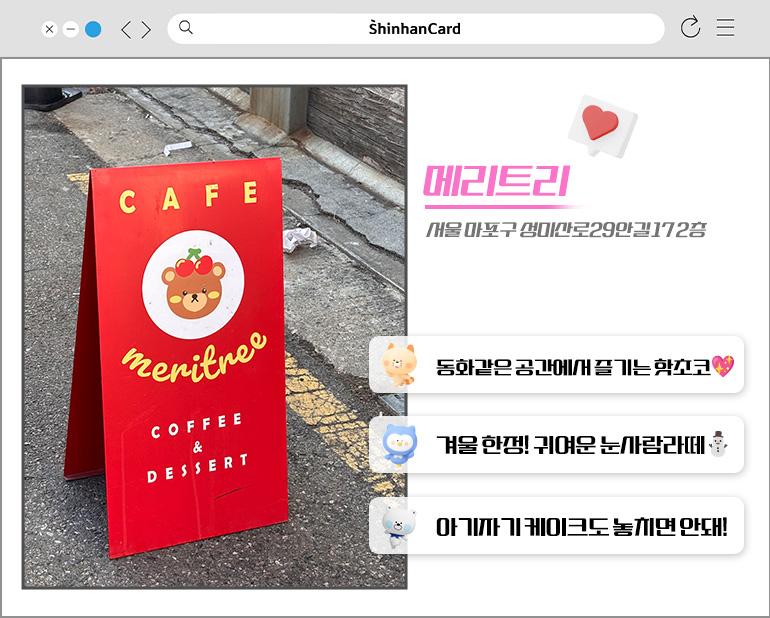 신카지기도 그 행렬에 빠질 수 없겠죠? 핫초코가 담긴 잔에 몸을 반쯤 걸친 채 활짝 웃고 있는 눈사람을 직접 마셔보니 매서운 한파도 잠시 잊게 하는 따뜻함이 번졌습니다. 이날은 높은 당 충전이 필요했던 터라, 꾸덕하고 쫀득한 브라우니에 초코 크림이 올라간 디저트 ‘초코멍뭉이’까지 곁들였는데요. 한 입 먹기 전에 이미 귀여운 비주얼만으로 어느 정도 힐링이 되는 느낌이었어요. 따뜻하고 달콤한 계절 음료 외에도, 메리 복숭아무스 / 얼그레댕댕이 / 라즈베리숑 등 메리트리만의 아기자기한 미감이 돋보이는 케이크로 유명한 이곳. 4계절 내내, 나만의 하루를 기념하고픈 순간에 다시 찾게 될 것 같아요!