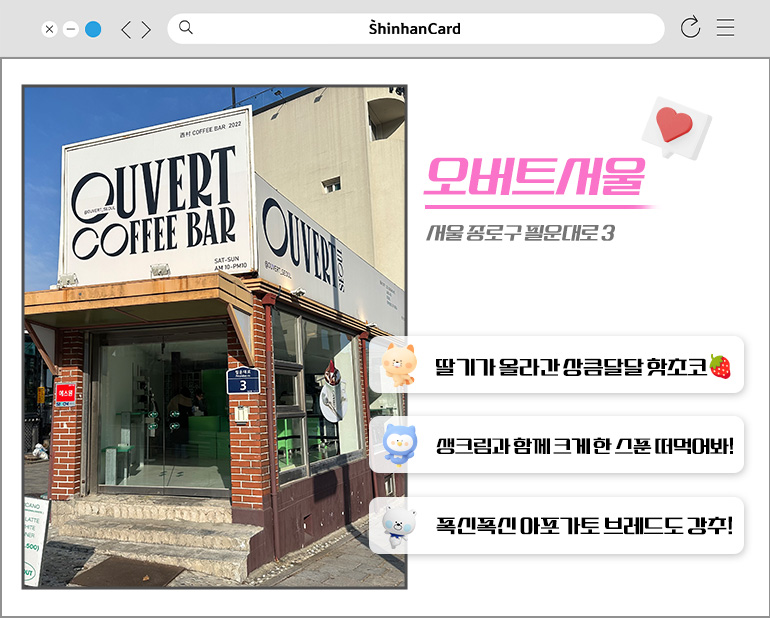 추운 날씨에도 발걸음을 멈추게 하는 눈에 띄는 외관의 오버트서울은 특별한 크림핫초코로 유명합니다. 핫초코는 뭐니 뭐니 해도 딥하면서도 물리지 않는 달달함이 지속되어야 하는 법! 오버트 서울의 크림핫초코는 아무리 마셔도 텁텁하지 않고 깔끔하게 당을 충전해 주는데요. 특히 생크림과 앙증맞은 딸기 주변으로 가득 뿌려둔 토핑 초콜릿을 오도독 씹으며 천천히 즐기는 핫초코는 한 잔으로 겨울의 맛을 완성해 준답니다!