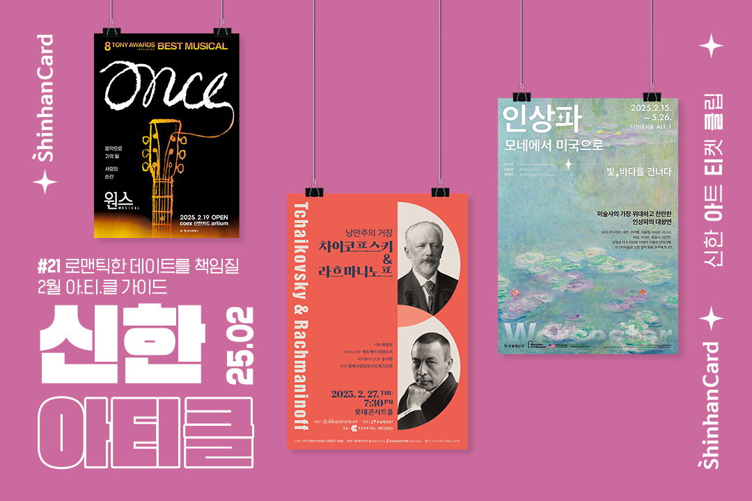겨울을 보내는 아쉬움과 봄을 기다리는 설렘이 교차하는 2월, 신한카드가 추천하는 공연, 전시 소식 어떠셨나요? 날은 조금씩 풀려가는데 이렇다 할 계획이 없으시다면, 신한 아티클의 로맨틱한 문화생활 가이드를 참고해 주세요. 따뜻한 감성과 반짝이는 영감을 가득 채울 기회가 될 테니까요. 사랑하는 사람과 함께하는 특별한 순간들이 모여 소중한 일상을 이어갈 원동력이 되어주길 바라며 신한 아티클은 다음 달에 새로운 소식으로 다시 찾아오겠습니다.