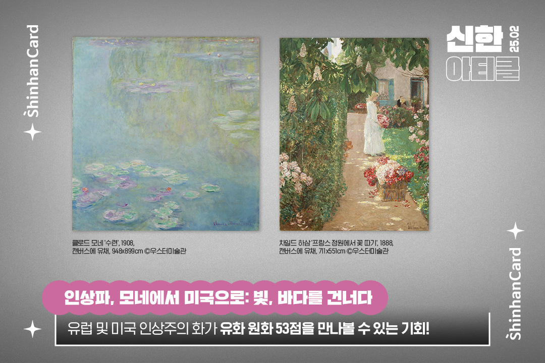 이번 전시를 위해 미국 매사추세츠에 위치한 우스터 미술관의 소장품 중 엄선된 53점이 바다를 건너왔는데요. 클로드 모네와 피에르 오귀스트 르누아르를 비롯한 인상주의의 대표 화가들, 후기 인상주의의 거장 폴 세잔, 그리고 미국 인상주의를 이끈 차일드 하삼, 메리 카사트, 존 싱어 사전트 등 총 39명의 작품을 만날 수 있습니다. 특히, 모네의 <수련>, 르누아르의 <아랍 여인>, 그리고 미국 인상주의 작품들에 담긴 그랜드 캐니언의 장엄한 자연 풍경도 만나볼 수 있습니다. 이번 특별전은 인상주의의 역사와 그 세계적 영향력을 조망할 귀중한 기회를 제공하는데요. 프랑스 인상주의의 주요 흐름은 물론, 국내에서 접하기 어려운 미국 인상주의의 발전 과정과 독창적 특징 그리고 독일과 북유럽 인상주의 작품들까지 한 곳에서 볼 수 있는 이번 전시는 특별한 예술적 경험을 선사할 것입니다. 다가올 봄을 기다리며 <인상파 모네에서 미국으로: 빛, 바다를 건너다>를 통해 예술적 영감을 얻고 새로운 시각을 확장할 수 있는 뜻깊은 시간을 가져 보시기 바랍니다!