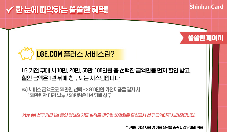 가전제품은 한 번 사면 오래도록 쓰는 제품이라 구매에 더욱 신중하게 되는데요. 더구나 목돈이 지출되기 때문에 여러 가지 할인 혜택을 알아보는 건 필수인 것 같습니다. 본격 이사철을 앞두고 가전을 구매할 계획이 있는데 이것저것 따져보고 알아보는 게 어렵다면? 이번엔 LGE.COM 신한카드와 함께하세요. 사용 실적에 따라 원하는 만큼 할인 받을 수 있으니까 합리적인 가전 쇼핑을 하실 수 있을 거예요. 가전제품의 명가 LG전자! 이제 플러스 서비스로 더욱 스마트하게 구매하시길 바랍니다.