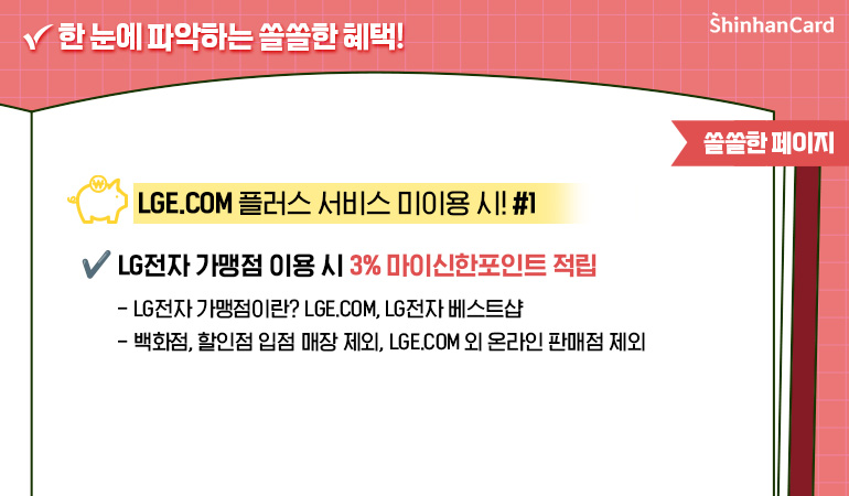 LGE.COM 플러스 서비스를 이용하지 않아도 괜찮습니다. 그냥 사용만 해도 받을 수 있는 혜택이 있거든요. 먼저 LG전자 특화 카드답게 LG전자 가맹점에서 카드를 이용하면 3% 마이신한포인트가 적립됩니다.