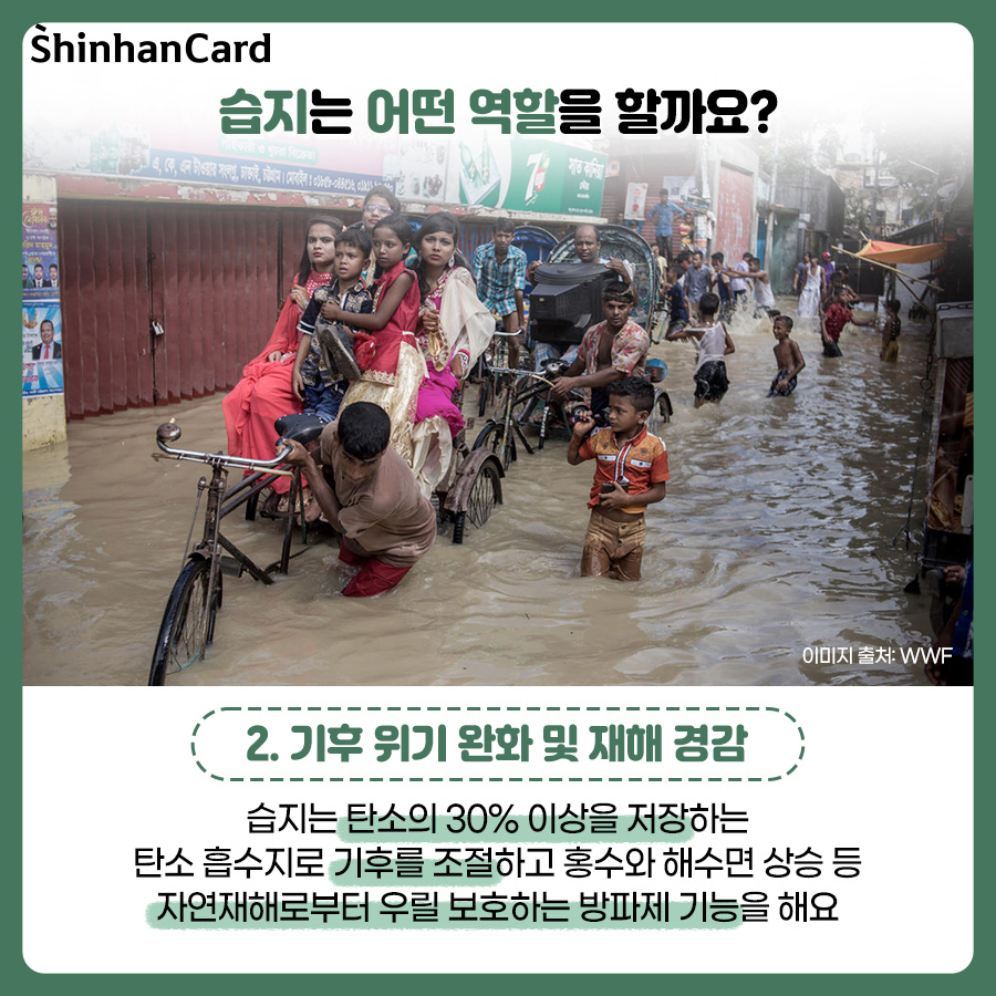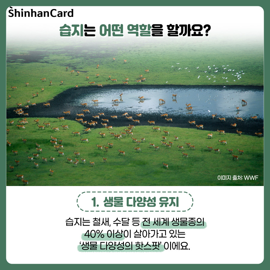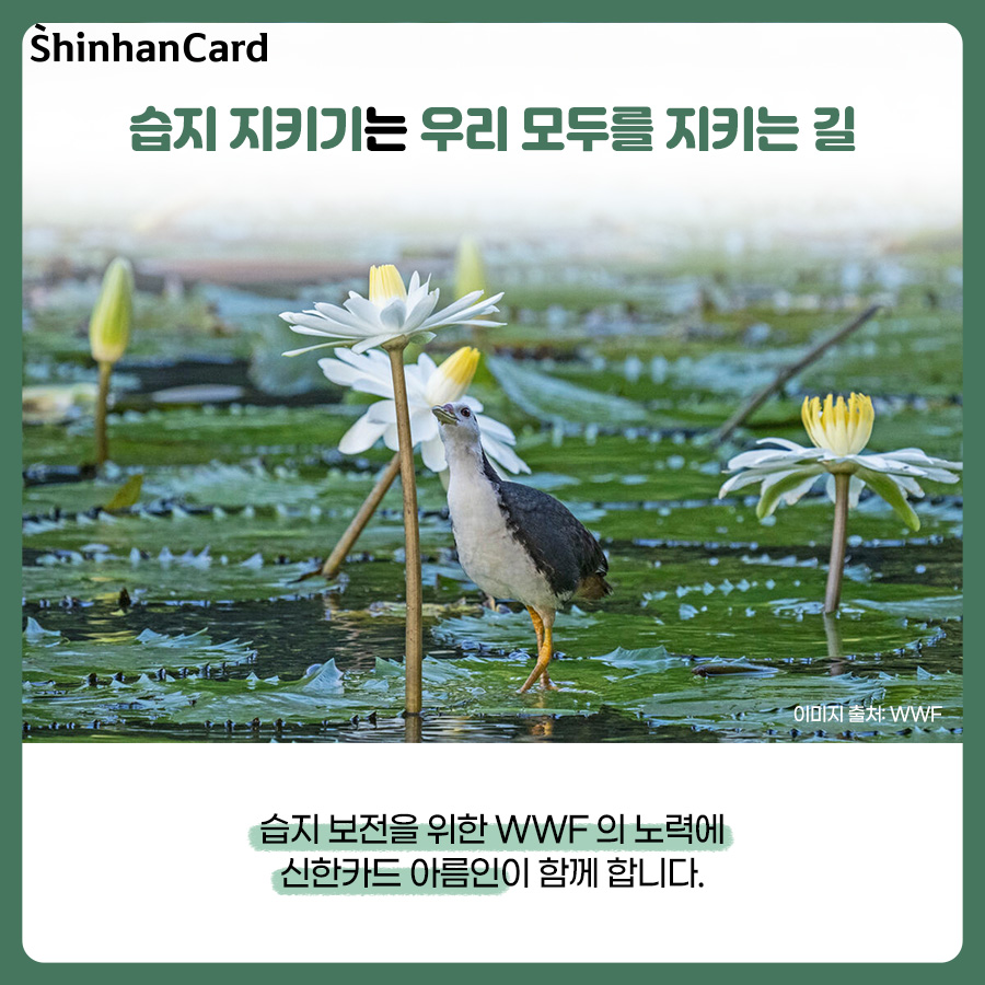 습지는 단순한 늪이나 물웅덩이가 아닙니다. 우리 삶과 직결된 소중한 자연의 일부이며, 반드시 보호해야 할 공간입니다. 습지 지키기는 우리 모두를 위한 일입니다. 이번 2월에는 신한카드 아름인이 WWF와 함께 ‘습지보전 캠페인’을 진행합니다. 자연과 우리의 미래를 위해 습지보호 캠페인에 동참해주세요 😊