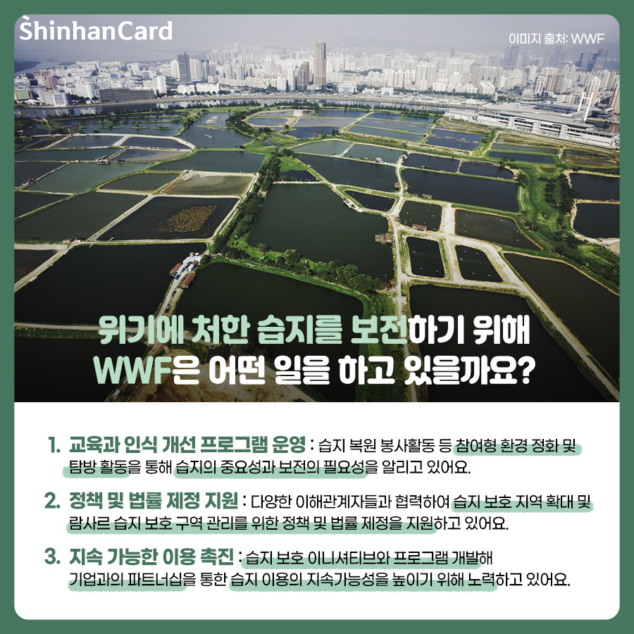 WWF는 대중을 대상으로 습지 복원 봉사활동 등 참여형 환경 정화 및 탐방 활동을 통해 습지의 중요성과 보전의 필요성을 알리는 교육과 인식 개선 프로그램을 운영하고 있습니다. 또한 다양한 이해관계자들과 협력하여 습지 보호 지역 확대 및 람사르 습지 보호 구역 관리를 위한 정책 및 법률 제정을 지원하고 있으며, 혁신적인 습지 보호 이니셔티브와 프로그램을 개발하여 기업과의 파트너십을 통한 습지 이용의 지속가능성을 높이기 위해 노력하고 있습니다. 습지를 보전하기 위해 노력하는 WWF의 다양한 활동 지원에 신한카드가 함께하겠습니다. 여러분도 마음을 더해주세요!