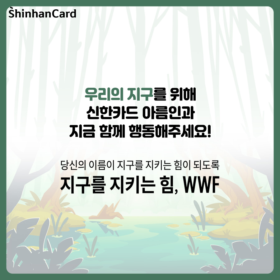 WWF는 대중을 대상으로 습지 복원 봉사활동 등 참여형 환경 정화 및 탐방 활동을 통해 습지의 중요성과 보전의 필요성을 알리는 교육과 인식 개선 프로그램을 운영하고 있습니다. 또한 다양한 이해관계자들과 협력하여 습지 보호 지역 확대 및 람사르 습지 보호 구역 관리를 위한 정책 및 법률 제정을 지원하고 있으며, 혁신적인 습지 보호 이니셔티브와 프로그램을 개발하여 기업과의 파트너십을 통한 습지 이용의 지속가능성을 높이기 위해 노력하고 있습니다. 습지를 보전하기 위해 노력하는 WWF의 다양한 활동 지원에 신한카드가 함께하겠습니다. 여러분도 마음을 더해주세요!