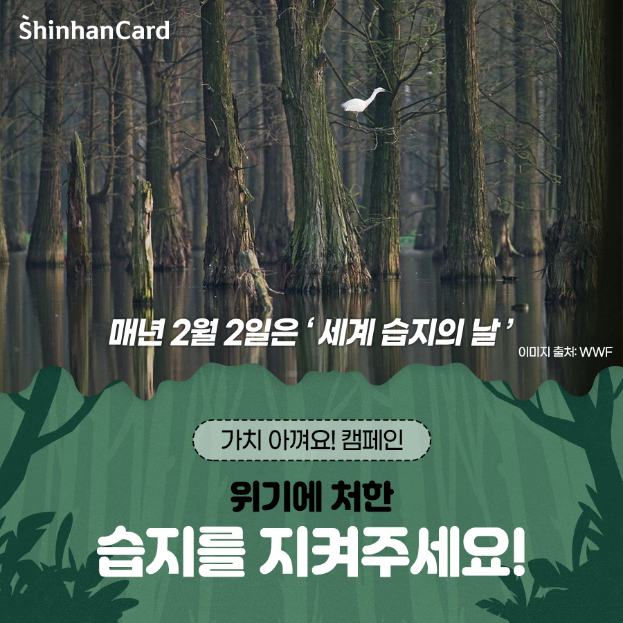 습지는 단순한 늪이나 물웅덩이가 아닙니다. 우리 삶과 직결된 소중한 자연의 일부이며, 반드시 보호해야 할 공간입니다. 습지 지키기는 우리 모두를 위한 일입니다. 이번 2월에는 신한카드 아름인이 WWF와 함께 ‘습지보전 캠페인’을 진행합니다. 자연과 우리의 미래를 위해 습지보호 캠페인에 동참해주세요 😊