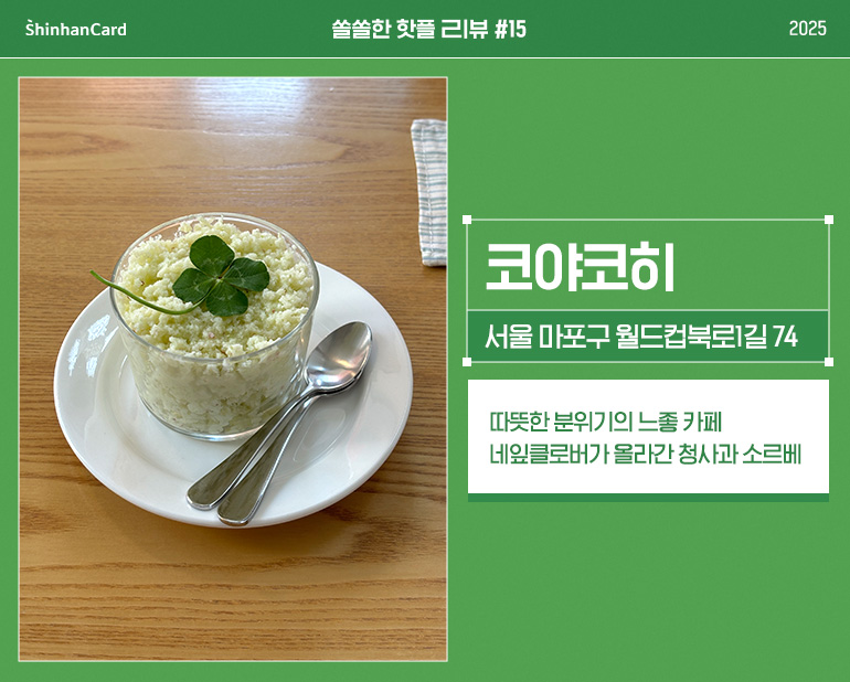 요즘 유행하는 ‘느좋(느낌 좋은)‘카페를 찾고 있다면 서교동의 코야코히를 추천합니다. 이곳에 있으면 행운은 특별한 게 아니라 일상에 은근하고 꾸준하게 자리하는 행복에 더 가깝다는 것을 느끼게 되거든요. 매력적인 시티팝이 흐르고 곳곳에 따뜻한 그림체로 고양이와 네잎클로버 일러스트가 그려져 있는 코야코히.