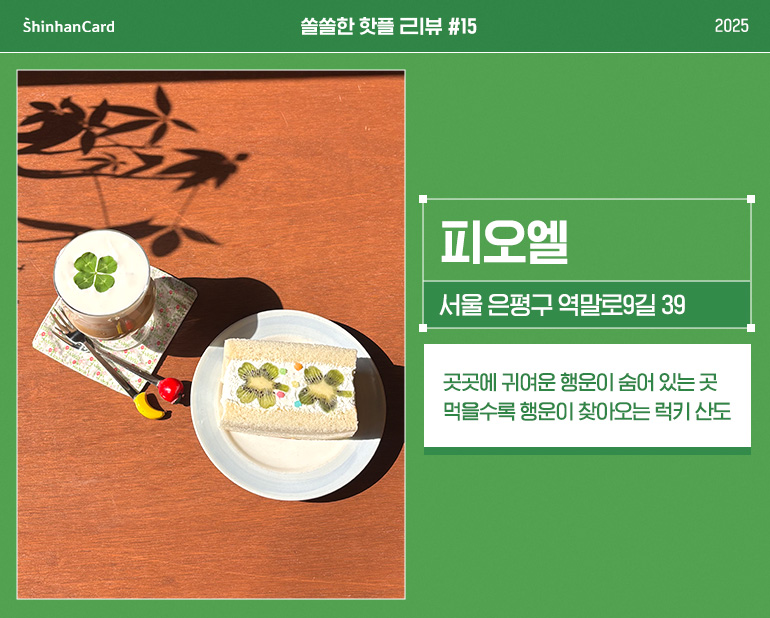 연신내에 위치한 카페 피오엘은 곳곳에 귀여운 행운이 숨어 있는 곳입니다. 푸릇푸릇하고 아기자기한 인테리어 소품에서부터 따뜻하고 밝은 기운을 느낄 수 있는 피오엘. (무려 와이파이 비번마저 행운의 777!) 피오엘의 히든카드는 바로 ‘럭키 산도’인데요. 네잎클로버 모양의 키위가 큼지막하게 들어 있는 깜찍한 산도는 꼭 만화 속 아이템을 먹는 기분이었어요.