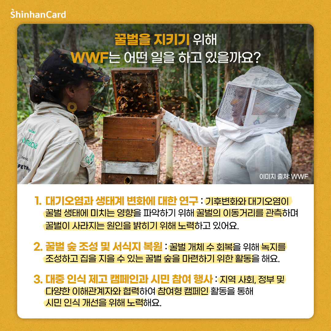 WWF는 기후변화와 대기오염이 꿀벌 생태에 미치는 영향을 파악하기 위해 꿀벌의 이동 거리를 관측하고, 꿀벌이 사라지는 원인을 밝히기 위해 생태계 변화에 대한 연구를 지속하고 있습니다. 또한 꿀벌 개체 수 회복을 위해 녹지를 조성하고 꿀벌의 서식지가 될 꿀벌 숲을 마련하기 위해 다양한 활동을 펼치고 있습니다. 그뿐만 아니라 지역 사회, 정부 및 다양한 이해관계자와 협력하여 참여형 캠페인 활동을 통해 시민 인식 개선을 위해 노력하고 있습니다. 꿀벌의 멸종을 막기 위해 노력하는 WWF의 다양한 활동 지원에 신한카드가 함께하겠습니다. 여러분도 따뜻한 마음을 더해주세요!
