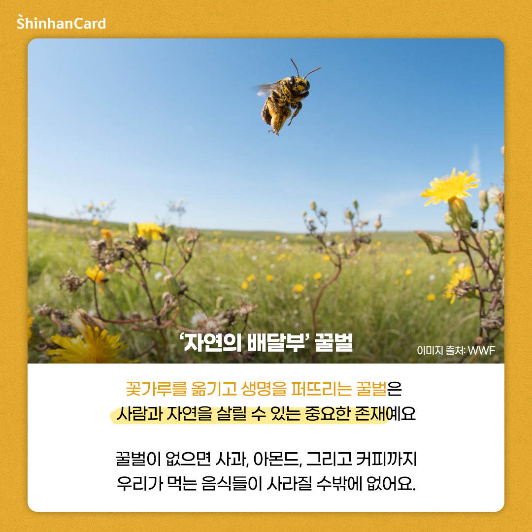 꿀벌의 실종은 단순히 한 종류의 곤충이 사라지는 것이 아닙니다. 이대로 가다가는 인간과 자연이 함께 무너질 수 있다는 무서운 경고입니다. 꿀벌이 건강하게 살아남아 생명을 이어가는 비행을 지속할 수 있도록, 생태계를 위한 달콤한 미션을 이어갈 수 있도록 도와주세요. 이번 4월에는 신한카드 아름인이 WWF와 함께 ‘꿀벌 보호 캠페인’을 진행합니다. 우리의 지구를 위해, 더 나은 미래를 위해 꿀벌 보호 캠페인에 동참해 주세요. 😊