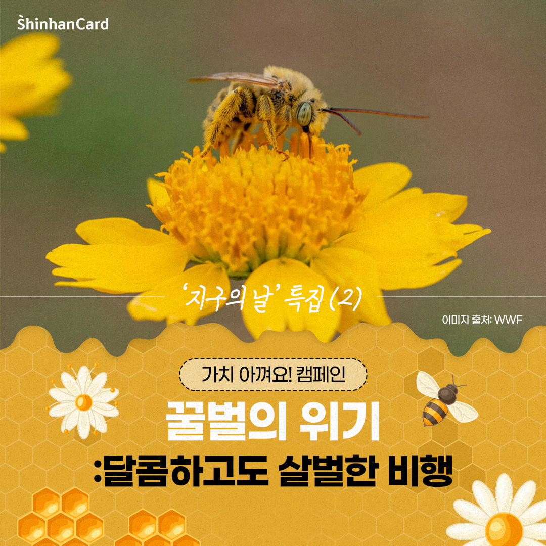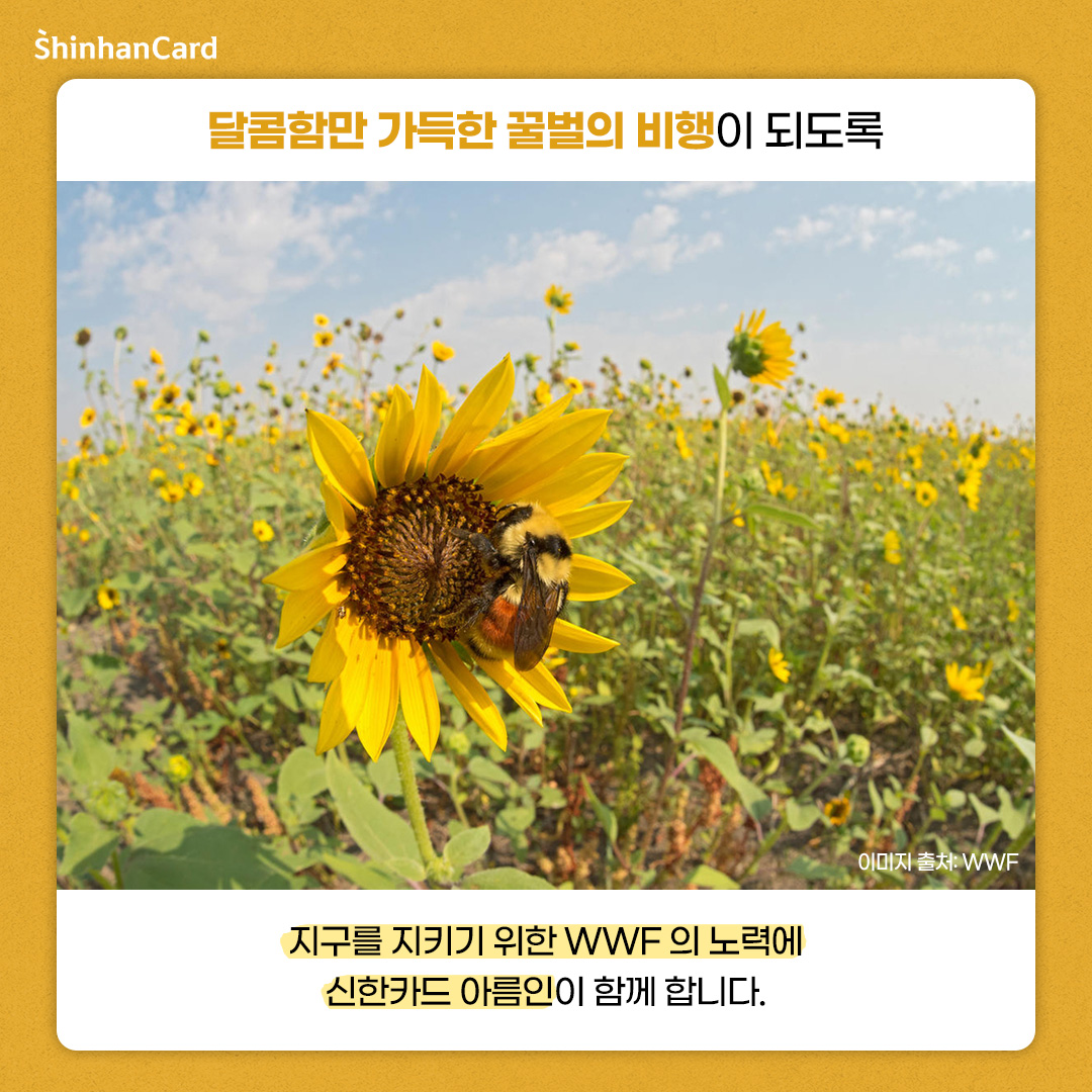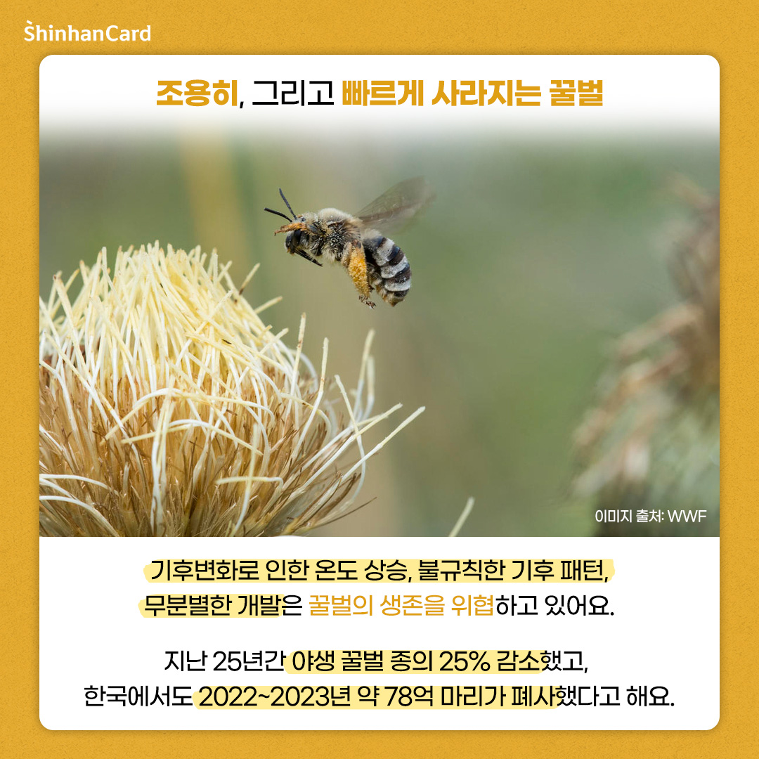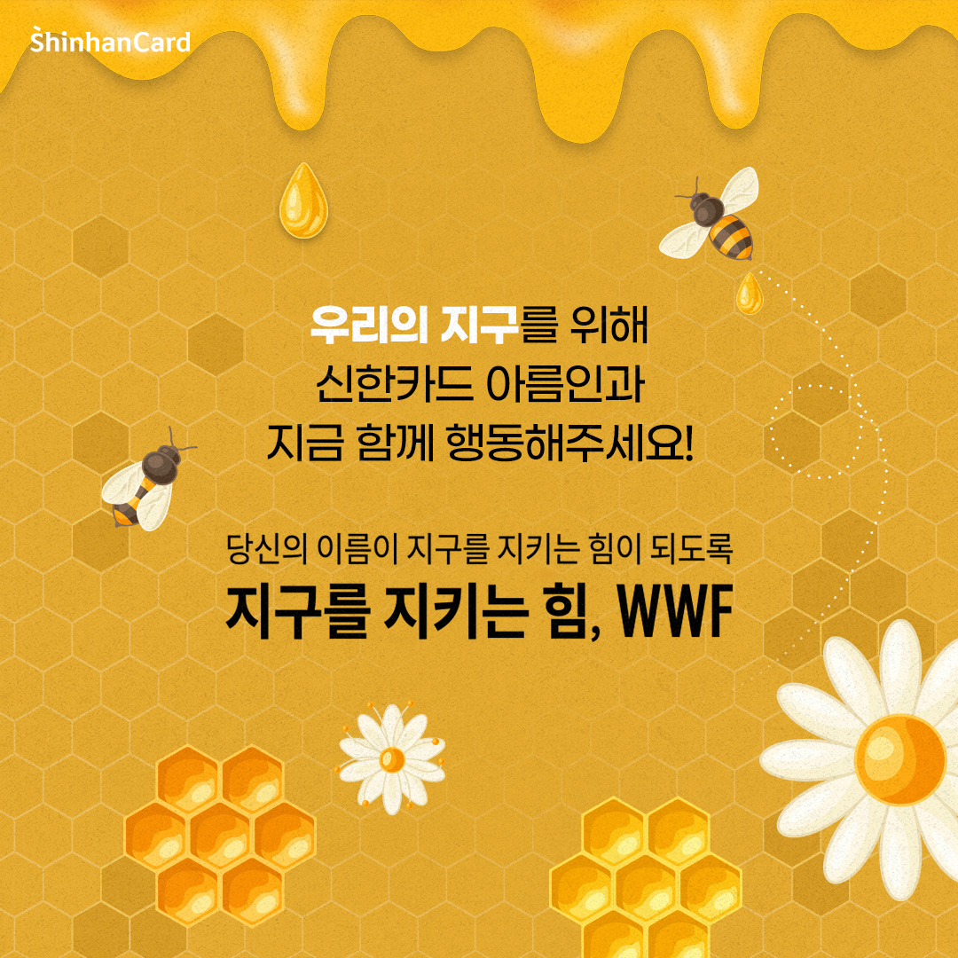 꿀벌의 실종은 단순히 한 종류의 곤충이 사라지는 것이 아닙니다. 이대로 가다가는 인간과 자연이 함께 무너질 수 있다는 무서운 경고입니다. 꿀벌이 건강하게 살아남아 생명을 이어가는 비행을 지속할 수 있도록, 생태계를 위한 달콤한 미션을 이어갈 수 있도록 도와주세요. 이번 4월에는 신한카드 아름인이 WWF와 함께 ‘꿀벌 보호 캠페인’을 진행합니다. 우리의 지구를 위해, 더 나은 미래를 위해 꿀벌 보호 캠페인에 동참해 주세요. 😊
