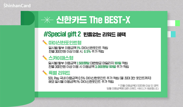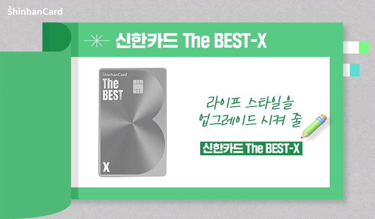 당신의 라이프 스타일을 빛나게 만들어 줄, 차원이 다른 프리미엄 신한카드 더 베스트 엑스(The BEST-X). 빈틈없는 리워드, 공항 라운지, 세심한 생활 할인 혜택까지! 모든 함께하는 순간이 특별해질 거예요. 프리미엄 카드를 찾고 있었다면? 나를 위한 최고의 선택! 신한카드 더 베스트-엑스 카드로 경험해 보세요. 😊