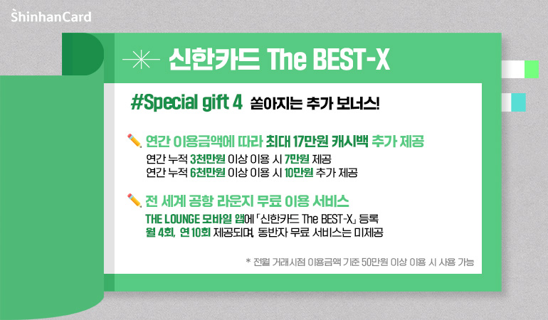 * 라운지 이용은 THE LOUNGE 모바일 앱에 「신한카드 The BEST-X」을 등록하면 라운지 이용권이 제공됩니다.