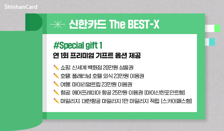 - 항공: 에어프레미아 항공 25만원 이용권 (더 베스트-엑스 마이신한포인트형만 제공)