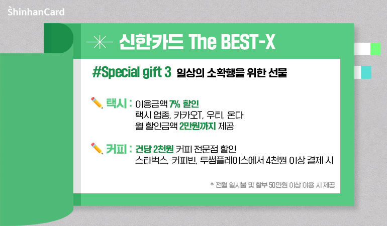 카카오T, 우티, 온다와 같은 교통App과 일반 택시를 이용할 때, 신한카드 더 베스트 엑스(The Best-X)를 사용하면 월 2만원까지 할인받을 수 있습니다. 또 커피 전문점(스타벅스, 커피빈, 투썸플레이스)에서 이용하면 4천원 이상 결제 시, 건당 2천원을 할인받을 수 있어요. 요즘 많이 사용하는 사이렌 오더, 스마트 오더 이용 시에도 할인되니까 커피 마실 때 꼭 챙겨주세요!