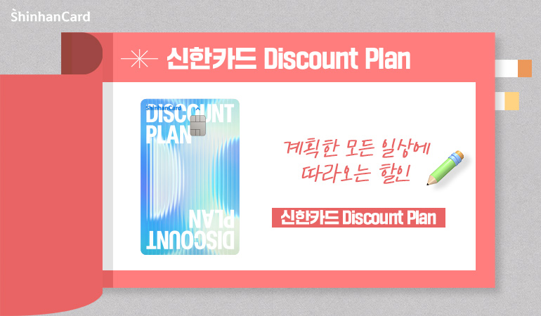 커피 1잔, 식사 1끼, 공과금 납부 1건. 그냥 지나쳤던 소비에도 할인이라는 가치를 더하면, 평범했던 일상이 달라집니다. 이제는 언제, 어디서, 어떻게 할인받을지 계획하는 시대! 신한카드 Discount Plan과 함께 나만의 할인 스케줄을 완성해 보세요 :)