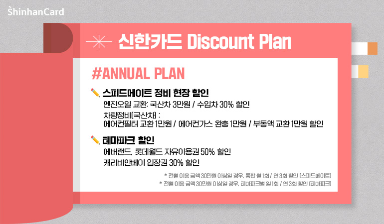* 전월 이용 금액 30만원 이상일 경우, 테마파크별 일 1회 / 연 3회 할인