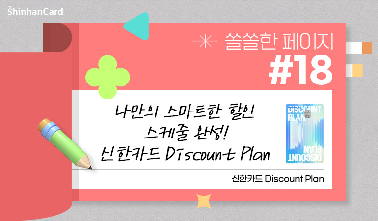 커피 1잔, 식사 1끼, 공과금 납부 1건. 그냥 지나쳤던 소비에도 할인이라는 가치를 더하면, 평범했던 일상이 달라집니다. 이제는 언제, 어디서, 어떻게 할인받을지 계획하는 시대! 신한카드 Discount Plan과 함께 나만의 할인 스케줄을 완성해 보세요 :)