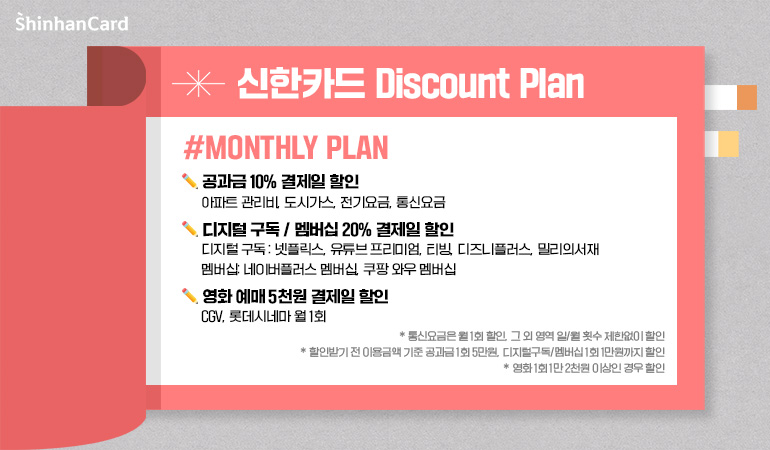 매달 찾아오는 공과금, 통신비, 보험료 납부도 당연히 할인이 필요하겠죠! 정기적으로 반복되는 고정 지출은 먼슬리 플랜 서비스로 해결하세요. 자칫 놓치기 쉬운 고정비까지 챙기는 먼슬리 플랜, 한 달의 시작을 보다 스마트하게 열어줍니다.