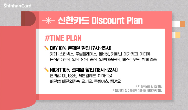 그래서 오늘은 익숙한 일상 속 소소한 즐거움이 되어 줄 스마트한 ‘할인 스케줄’을 완성할 수 있는 꿀팁을 소개해 드리려 합니다. 바로, 신한카드 Discount Plan! 소비가 일어나는 시간대와 장소, 생활 패턴에 맞춰 하루, 매일, 매월을 계획적으로 할인해 주는 스마트한 할인 스케줄 서비스를 만나 보세요!