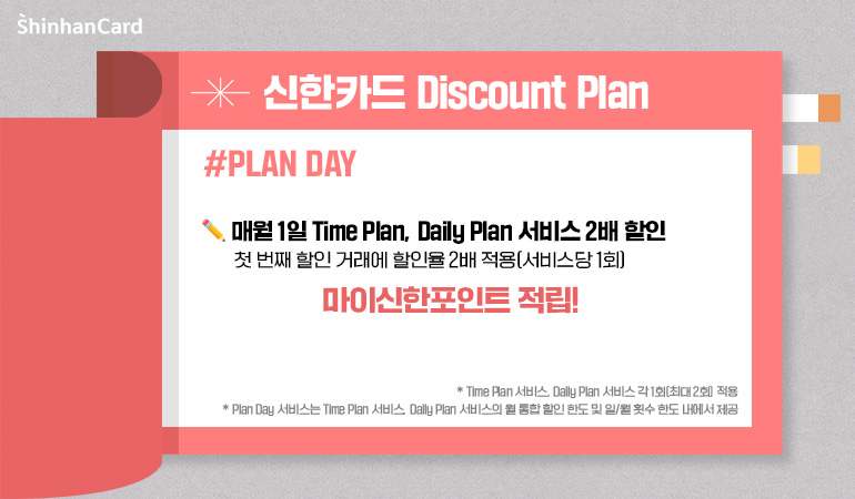 매월 1일은 Discount Plan을 쓰는 모든 분을 위한 특별한 날입니다. Time Plan & Daily Plan 서비스의 할인율이 2배로 상승하기 때문이죠. 서비스당 첫 번째 할인 거래에 할인율 2배가 적용됩니다.