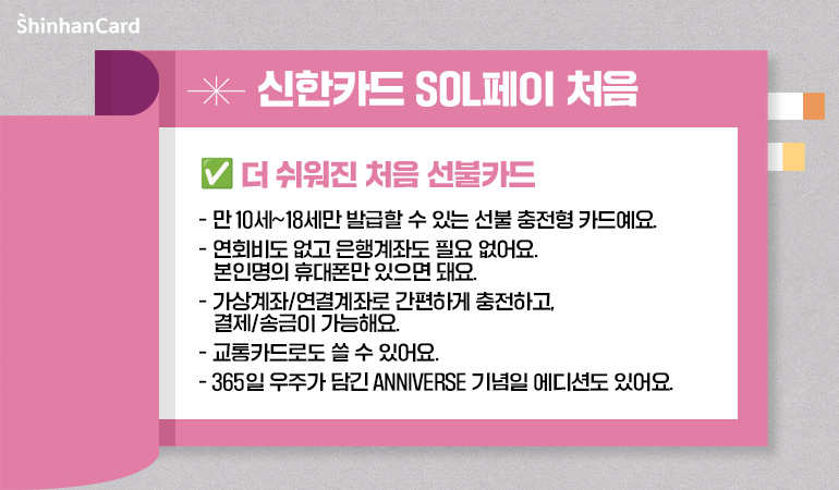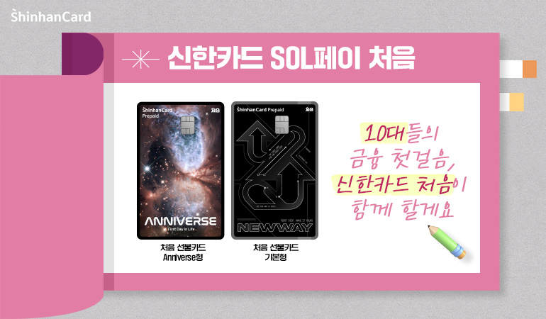 디지털에 익숙한 요즘 10대, 생활 속에서도 스스로 판단하고 선택하는 경험이 늘고 있습니다. 스마트폰 하나로 다양한 것을 해결하는 세대에게 맞춘, 똑똑한 금융의 시작! 오직 10대만을 위한, 10대 전용 SOL페이 <신한 SOL페이 처음>을 소개합니다. 만 10세에서 18세라면 신한카드가 준비한 특별한 혜택을 만나보세요 :)
