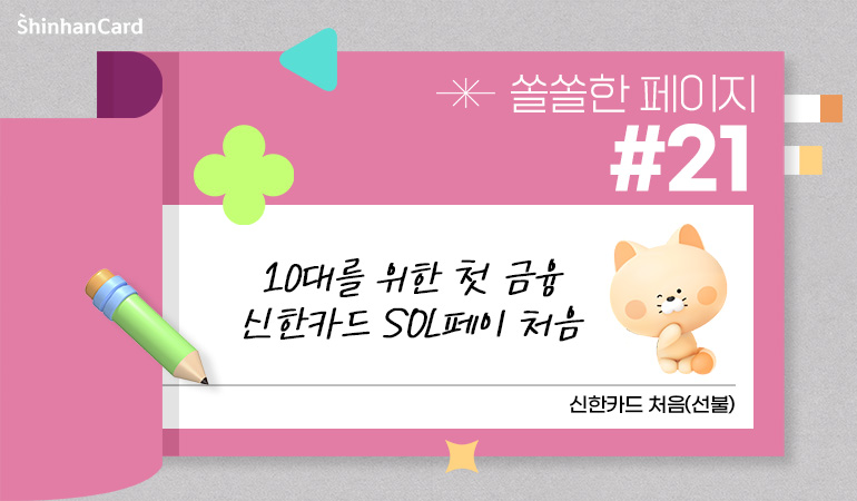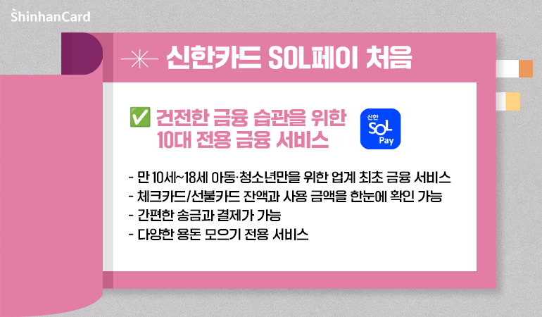 빠르게 변화하는 세상, 금융도 예외가 아닙니다. 이제 10대도 스스로 금융을 경험하고 배워나가야 할 때! 신한카드 SOL페이 처음은 청소년 여러분이 안전하고 똑똑하게 첫 금융 습관을 시작하도록 돕겠습니다. 작지만 확실한 혜택부터, 일상을 관리하는 똑똑한 습관까지. 10대 여러분의 금융 첫걸음, 신한카드가 함께 할게요 😊
