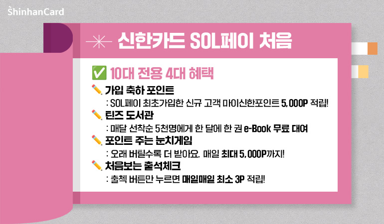 'SOL페이 처음’ 론칭에 맞춰 10대 전용 특별 혜택도 준비했습니다. 신규 고객이면 받을 수 있는 축하 포인트와 무료로 e-Book을 대여해주는 ‘틴즈 도서관’, 앱 접속 후 오래 버티면 포인트를 주는 ‘눈치게임’과 레벨에 따라 포인트를 나눠 갖는 ‘처음보는 출석체크’까지, 실용성과 재미까지 모두 담았습니다.