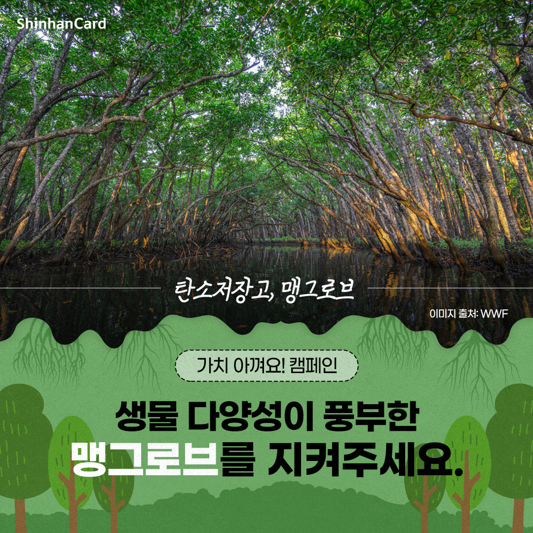 맹그로브 숲은 해양 생물들에게는 집이 되고, 해안가 주민들에게는 재난을 막아주는 방패이며 기후 위기 시대를 살아가는 인류에게는 탄소를 저장해주는 저장고의 역할을 하는 중요한 숲입니다. 맹그로브가 사라지면 우리는 해양 생물 다양성을 잃고, 기후 위기를 더 빠르게 마주하게 되며, 해안에 사는 수많은 사람들의 삶이 위험에 놓이게 됩니다. 이제는 이 숲을 지켜야 할 때입니다. 이번 7월, 신한카드 아름인은 WWF와 함께 ‘맹그로브 보전 캠페인’을 진행합니다. 맹그로브가 탄소를 품고 생명을 지키는 지구의 숨이 될 수 있도록 ‘맹그로브 보전 캠페인’에 여러분도 함께해 주세요! 😊