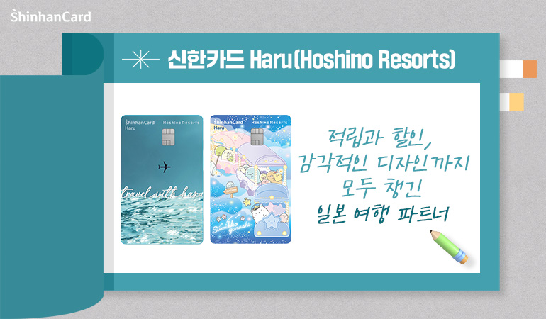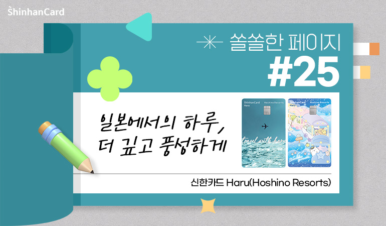 여름 햇살이 가득한 요즘, 어디론가 훌쩍 떠나고 싶은 마음이 드는 건 자연스러운 일이죠. 특히 일본은 가깝고도 다양한 매력을 지닌 여행지로 많은 분들이 찾는 여행지 중 하나예요. 맛있는 음식, 감성 가득한 거리, 그리고 특별한 숙소까지. 일본 여행을 더 특별하게 만들어 줄 신한카드의 새로운 제안, 신한카드 Haru(Hoshino Resorts)! 이름처럼 하루하루가 설레는 여행이 되도록, 혜택도 꽉 채운 카드를 소개합니다.