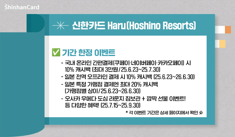 먼저, 일본 현지에서 신한카드 Haru(Hoshino Resorts)로 결제하면 10% 캐시백 혜택이 제공됩니다. 특정 가맹점에서는 최대 20%까지 캐시백이 적용되니 쇼핑이나 식사 때 자연스럽게 할인을 누릴 수 있죠.