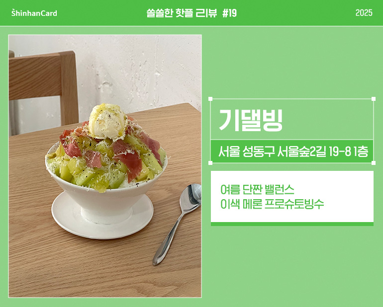 빙수로서는 낯선 조합이지만 곱씹어 보면 멜론론과 프로슈토가 핑거푸드로 얼마나 좋은 궁합이었는지 금세 떠올릴 수 있었어요. 곱게 갈린 얼음과 멜론, 프로슈토 위로 화룡점정인 바닐라 아이스크림이 올라간 빙수가 화려한 단짠의 맛을 선사한답니다. 아이스크림만큼 부드러운 멜론과 감칠맛 나는 프로슈토가 시원한 얼음을 감싸면서 호화로운 여름 간식을 즐길 수 있었어요. 빙수 맛집을 검색하고 온 곳인 만큼, 새로운 도전을 해보는 것이 인지상정! 기댈빙을 처음 방문해 보시는 분들은 고민 말고 꼭 ‘메론 프로슈토’ 빙수를 드셔보시길 추천합니다. 익숙한 더위를 새로운 맛으로 잊게 되는 짜릿한 추억이 남을 거예요.